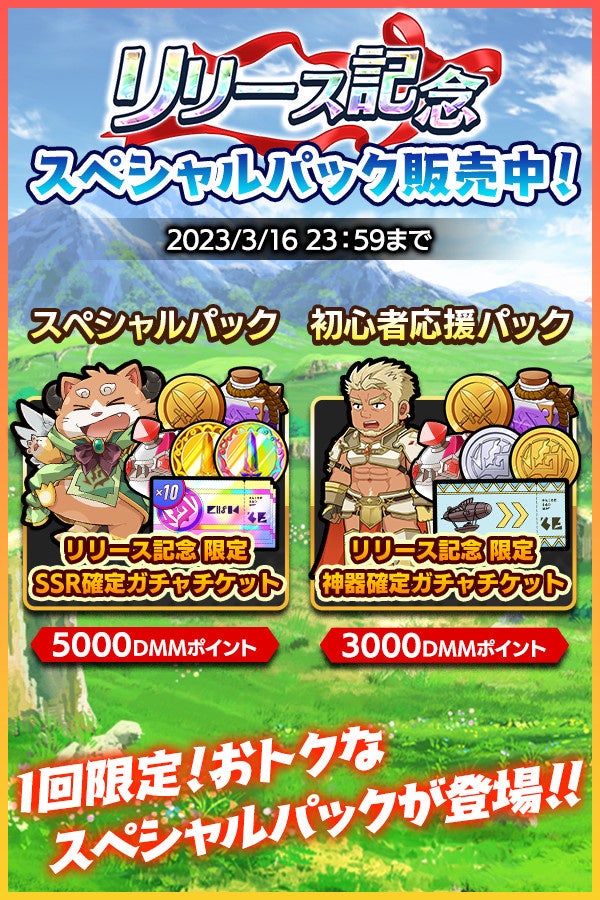 2023年2月16日(木)から3月16日(木)までの期間中、SSR確定ガチャチケットを含む「リリース記念スペシャルパック」や、3回までガチャの排出結果をやり直すことができる「SSR確定引き直しガチャ」を用意いたしました。