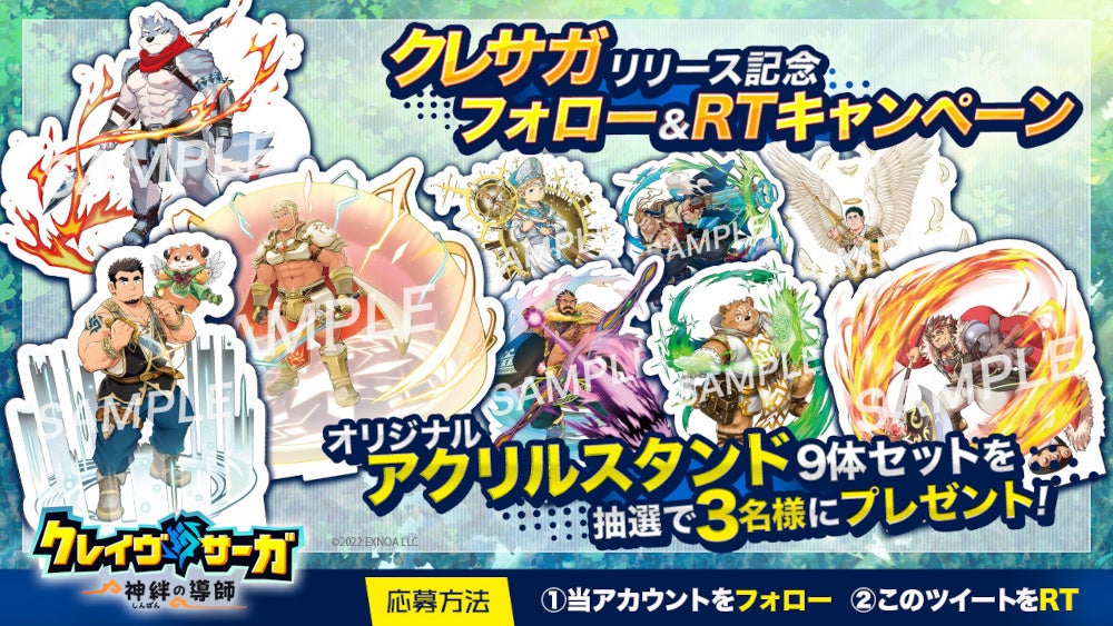 期間中、クレサガ公式Twitterアカウントをフォローし、対象のツイートをリツイートすると抽選で3名様に主人公・ハクマ・エクスカリバー・カラハ・ベルガモンド・ニネ・セルドア・ガブ・シュミエルをセットにしたアクリルスタンドをプレゼント!