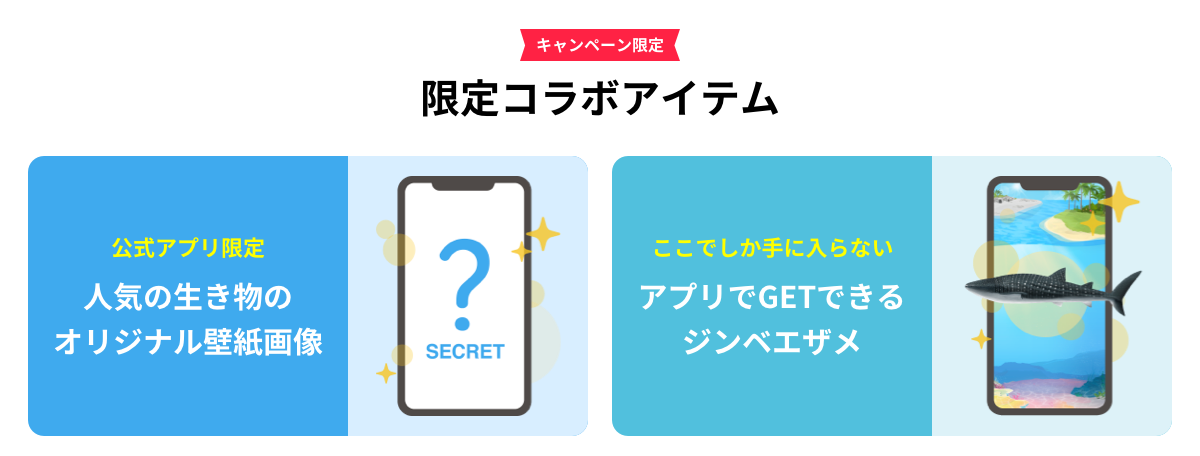 DMMかりゆし水族館の公式アプリではアプリの画面内を雄大に泳ぐジンベエザメが、海洋博公園×沖縄美ら海水族館の公式アプリではオリジナルスマートフォン用壁紙画像が、条件をクリアすることでそれぞれ手に入ります。