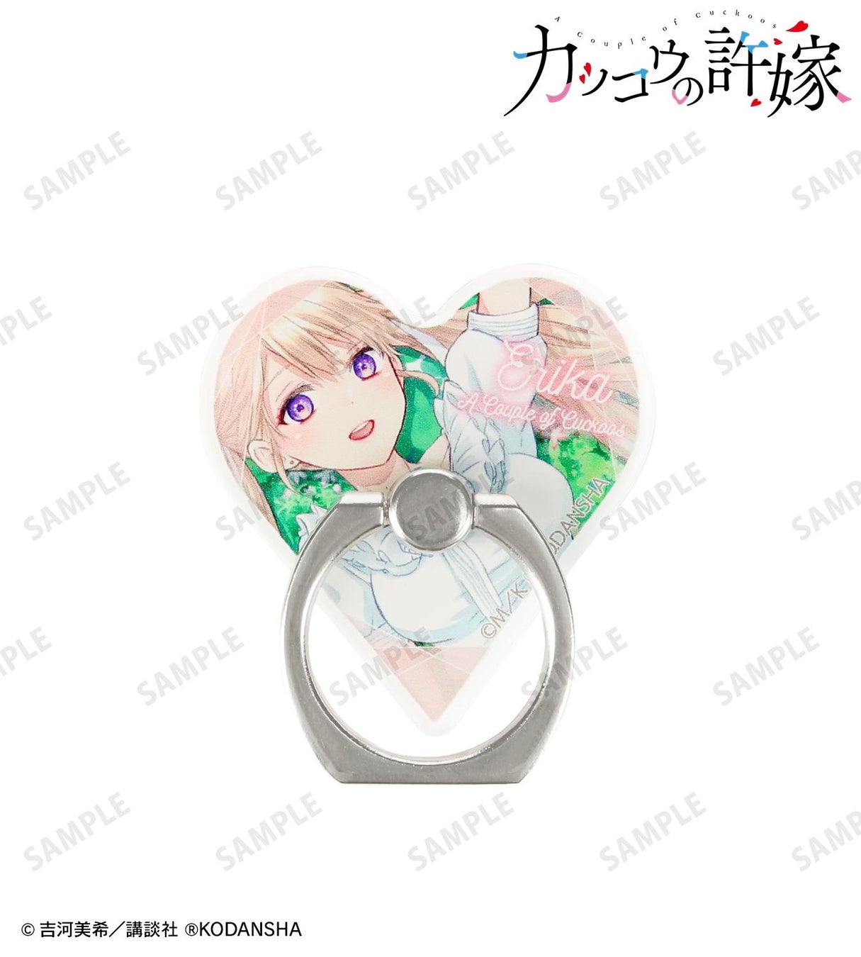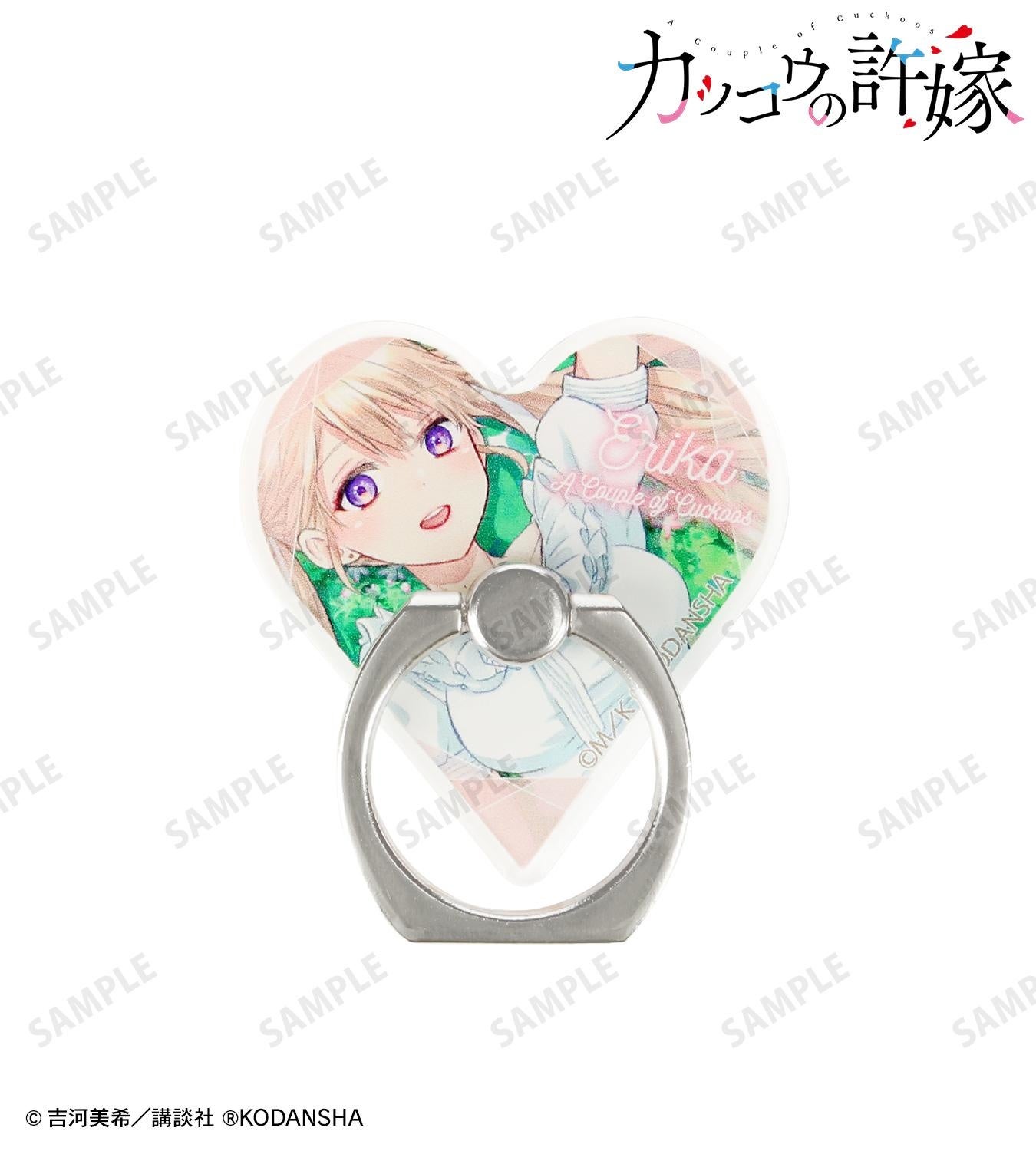 天野エリカ、瀬川ひろ、海野幸を名前や作品タイトルと合わせてレイアウトし、ハート型のスマホリングに仕上げました。
