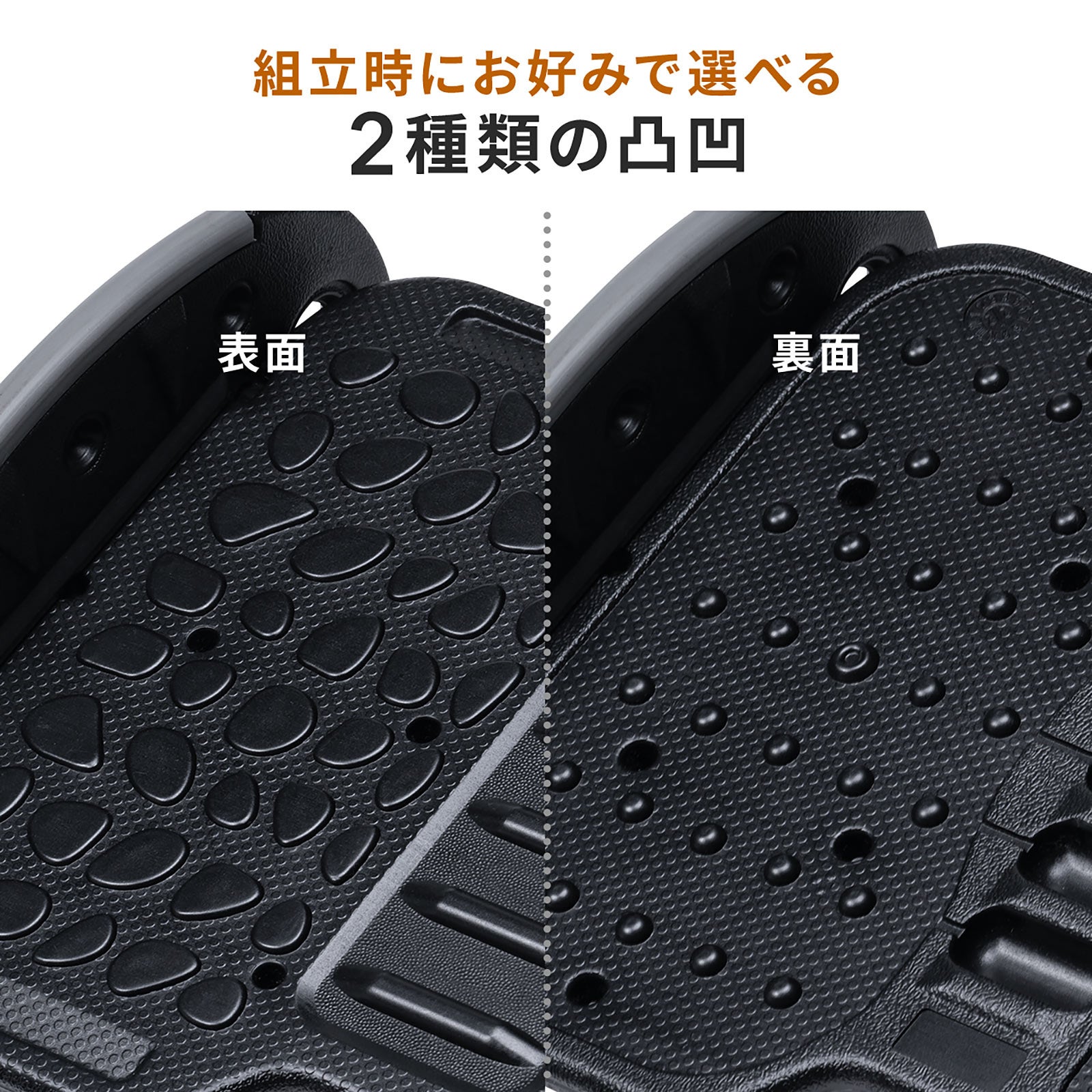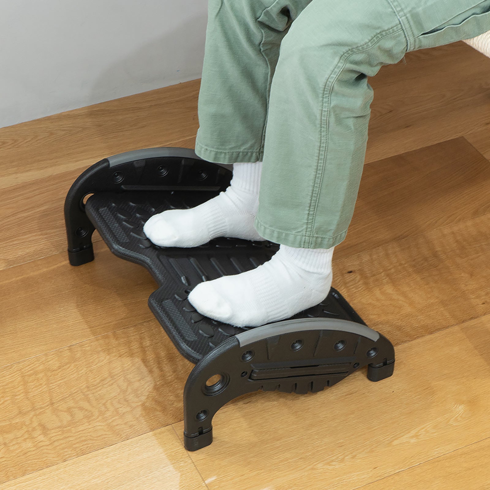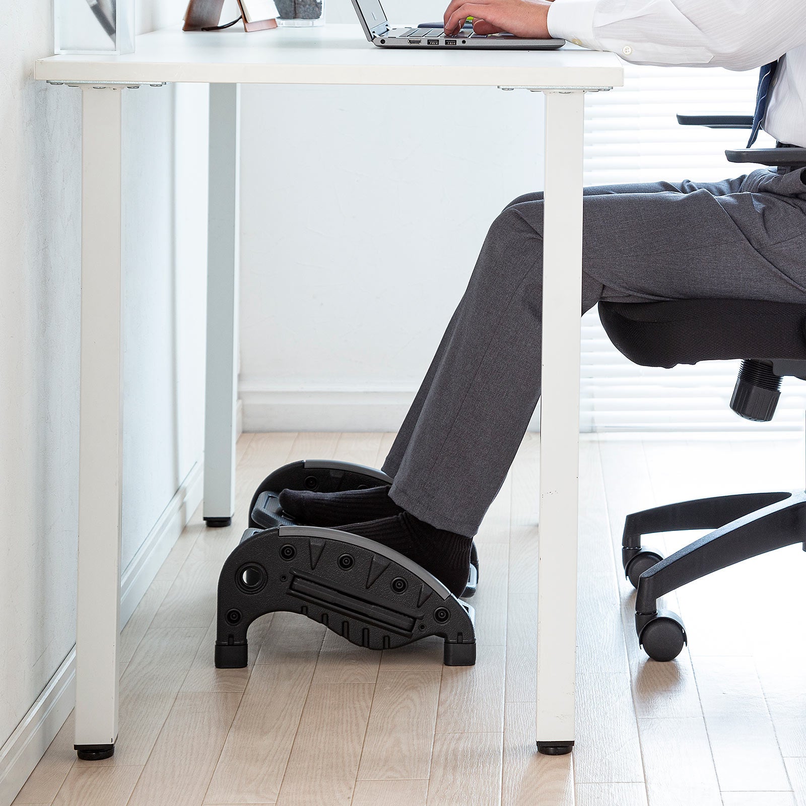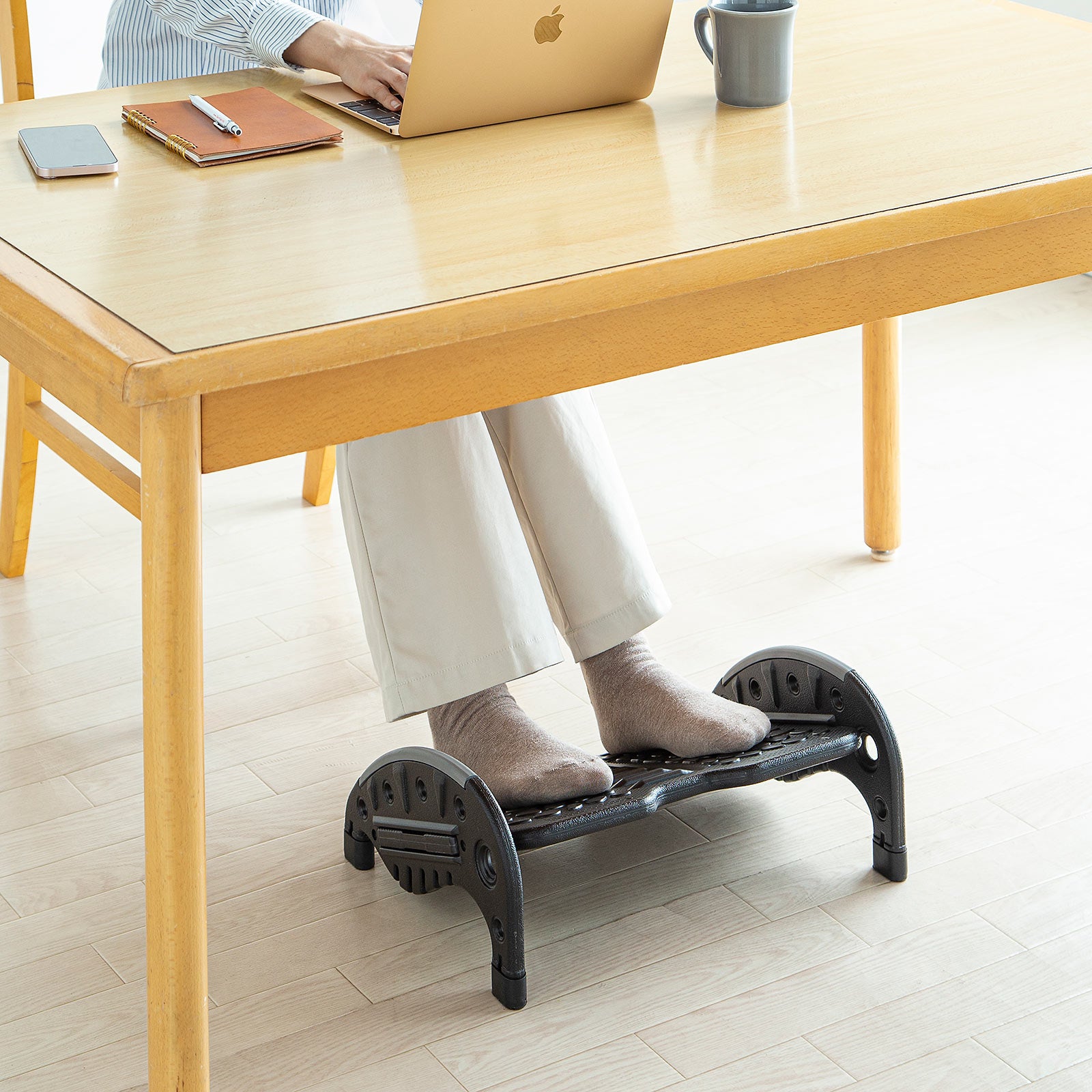 フットレストに足を乗せることで正しい姿勢を維持しやすくなり、デスクワークによる足の疲れやむくみを軽減できます。足置き面は凹凸があり、軽いマッサージ効果があります。