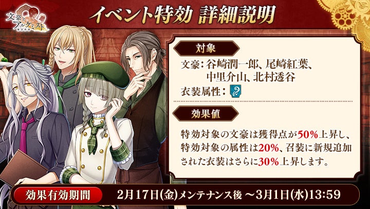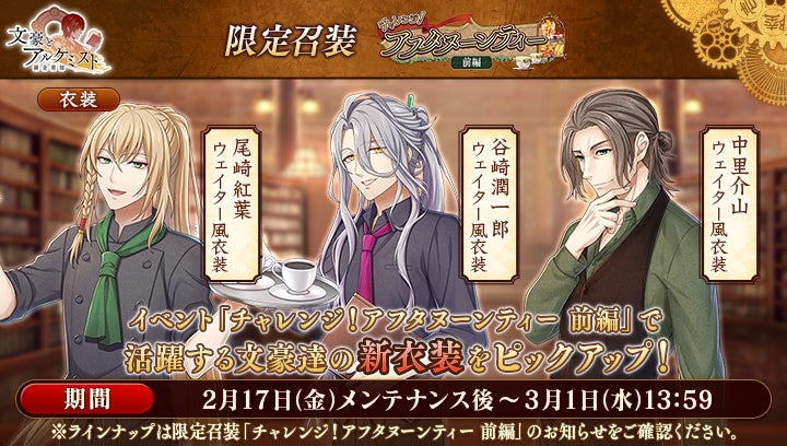 さらに、イベントと同時に開催される限定召装『チャレンジ!アフタヌーンティー 前編』にて新規追加された「谷崎潤一郎」「尾崎紅葉」「中里介山」の〈ウェイター風衣装〉を編成すると、得点の獲得率がそれぞれ30%上昇します。
