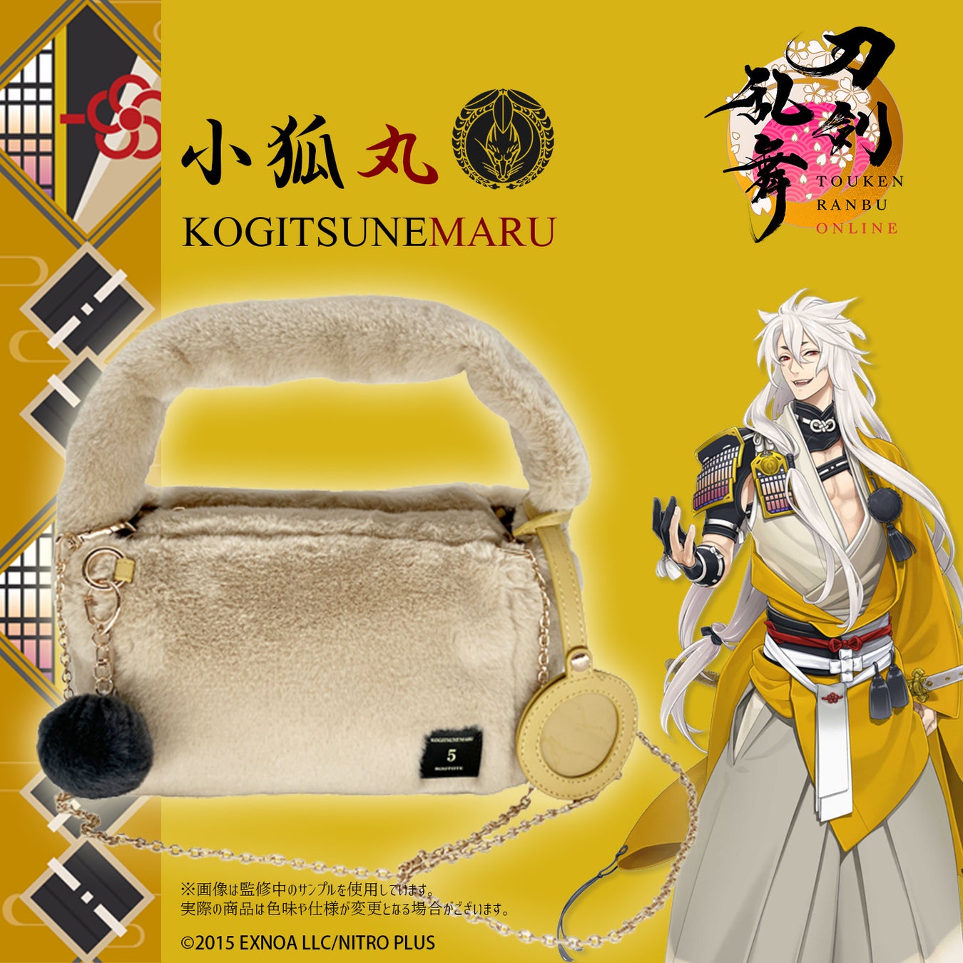 小狐丸をイメージした黄金色を基調としたバッグです。小狐丸の刀帳番号である「5」「KOGITSUNEMARU」のネームタグがポイント。