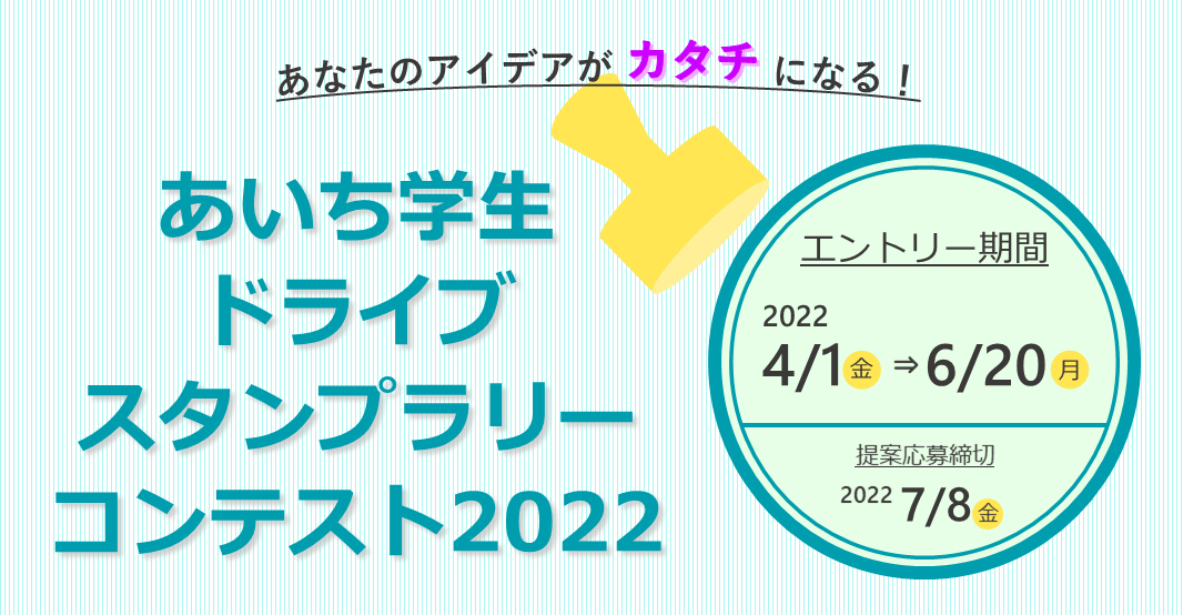 JAF(一般社団法人 日本自動車連盟)愛知支部(支部長 寺町一憲)は、4月1日(金)より、「あいち学生ドライブスタンプラリーコンテスト2022」のエントリーを開始しました。