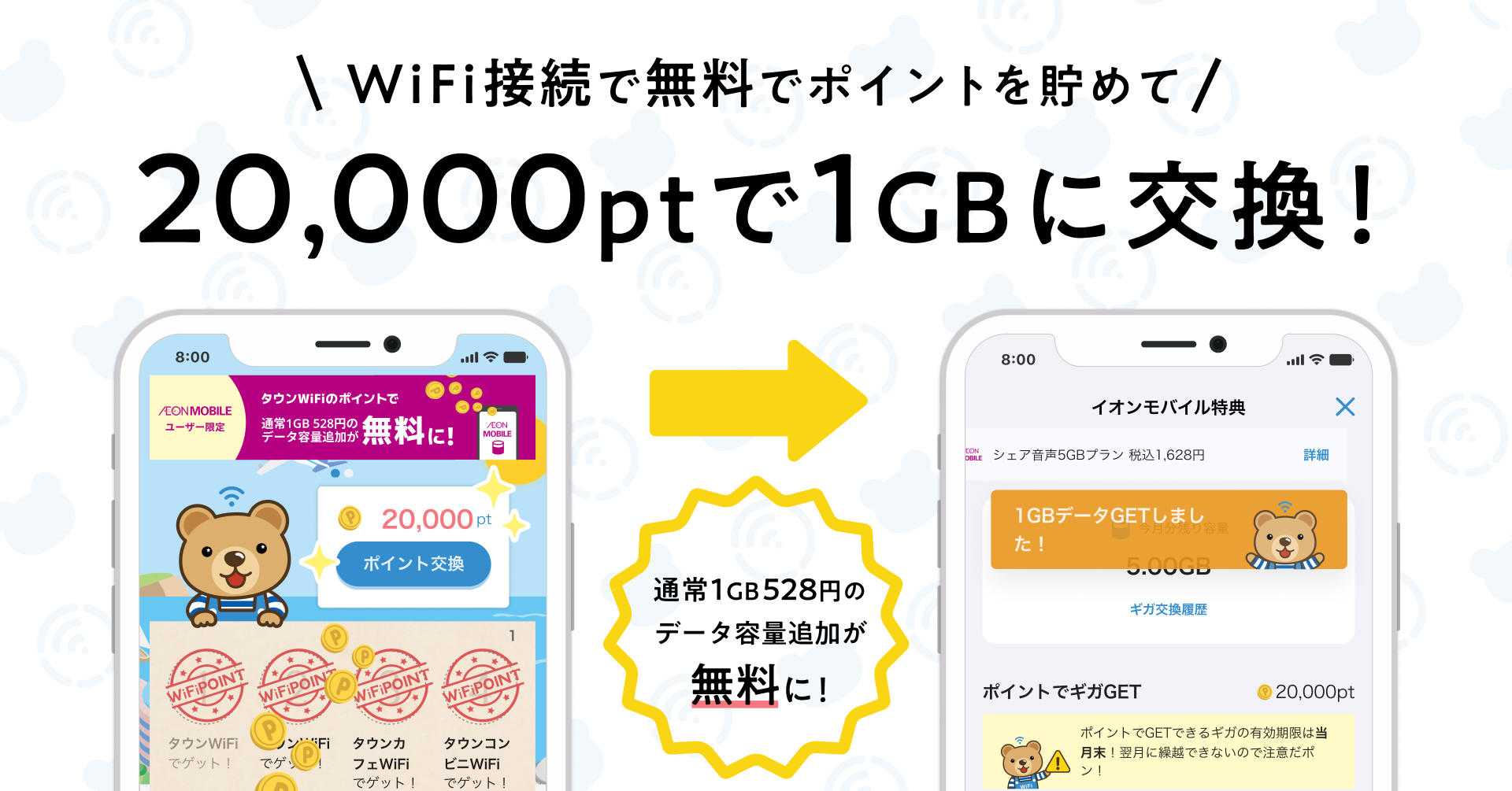 具体的には、タウンWiFi byGMO経由での対象のフリーWiFiへの接続と、接続時にアプリ内で動画広告を見ることで獲得できる「WiFiポイント」を、イオンモバイルの高速データ通信容量と交換できます(20,000pt=1GB分※3)。