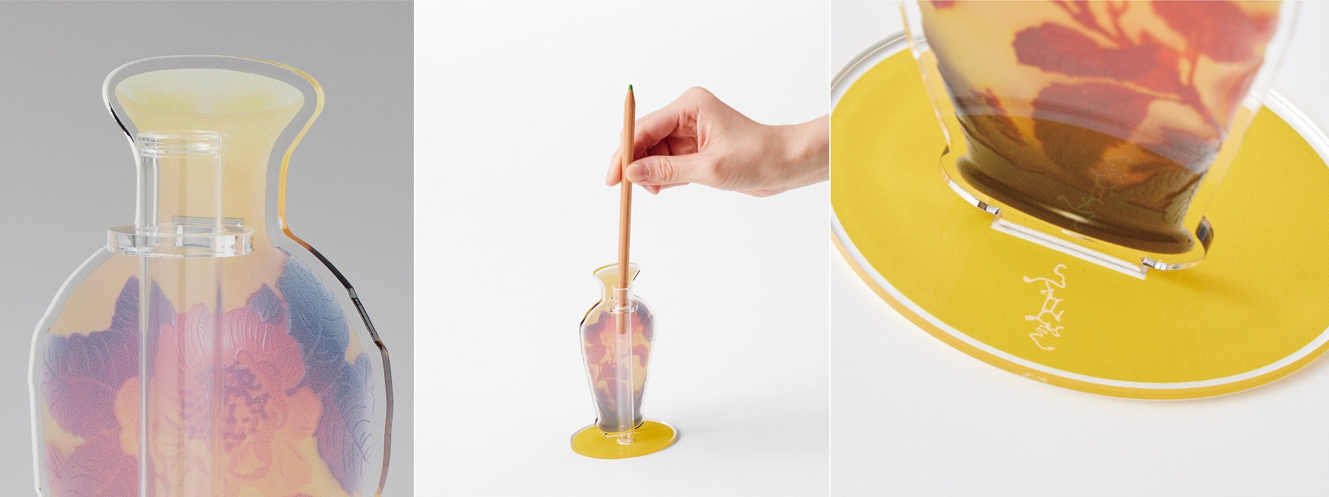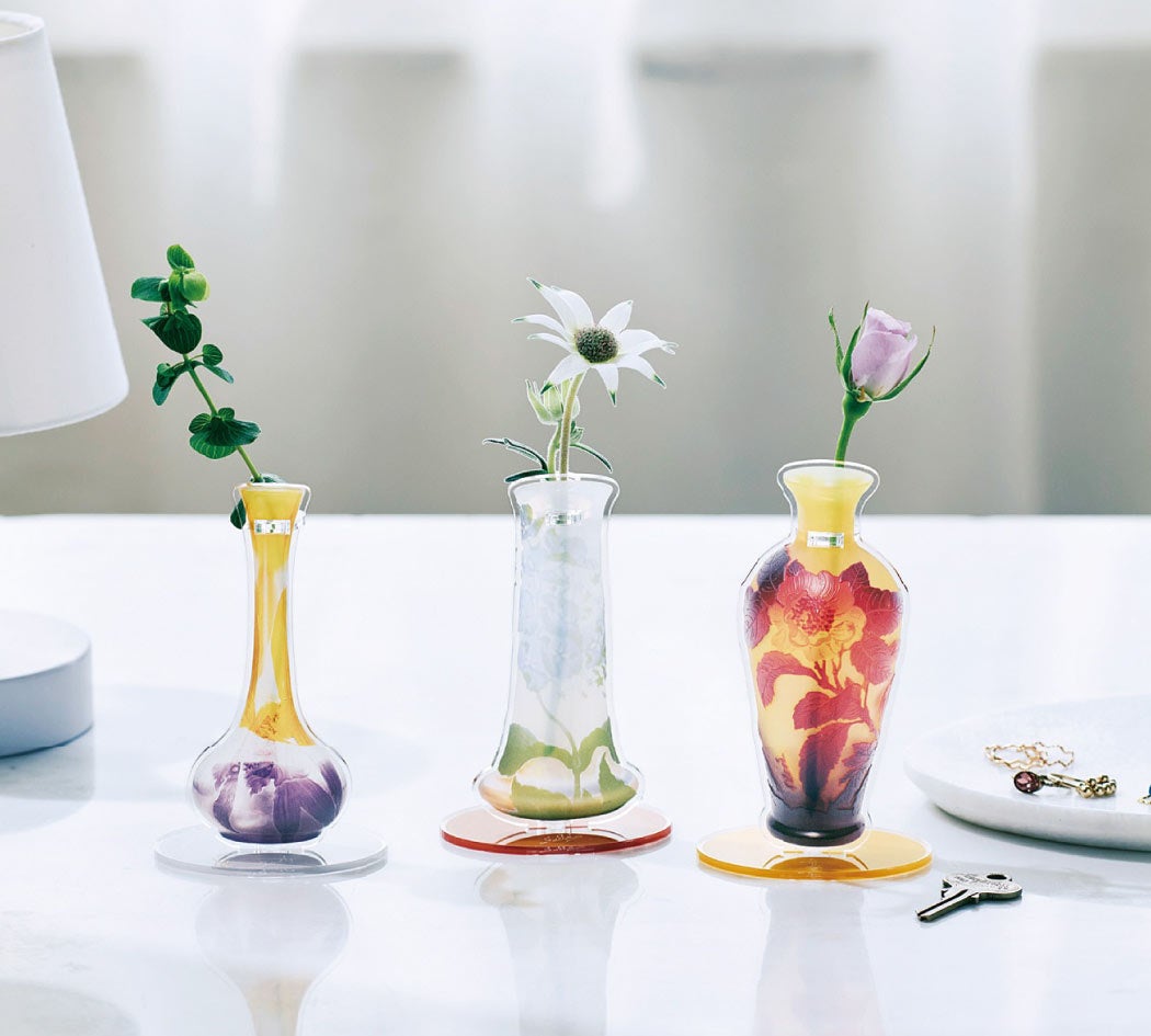 エミール・ガレの手による美しいガラス工芸品を、一輪挿しとしても使えるアクリルスタンドに仕上げたアイテムです。エミール・ガレの作品そのもののように、光とともに華やぎを見せるデザインのモチーフは、〈アイリス文大花瓶〉〈紫陽花文花瓶〉〈バラ文花瓶〉の3種類です。