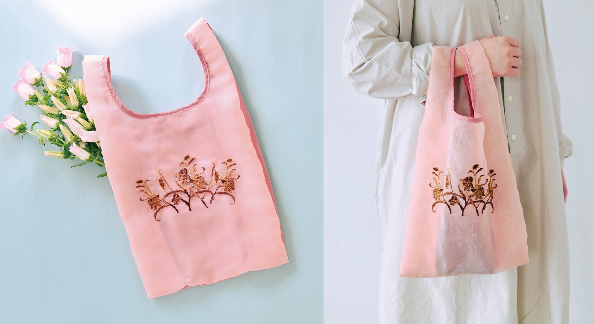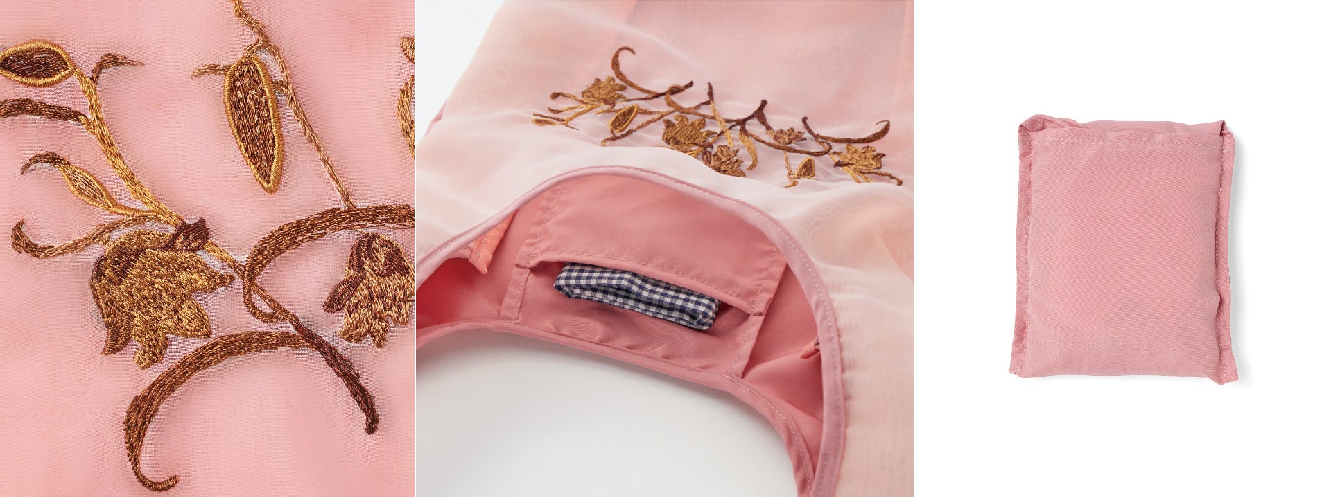 光が揺らめくような繊細な色使いの刺しゅうが美しいデザインです。裏側は、中に入っているものが見えない不透明生地で仕上げられています。使わないときはコンパクトにたためる、便利な内ポケット付きです。