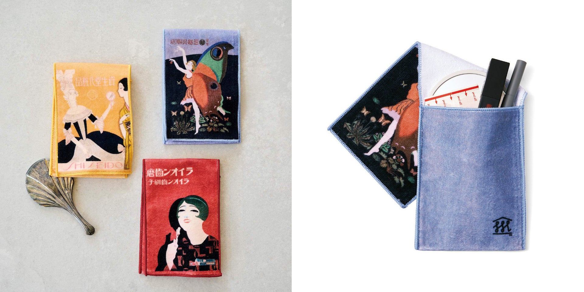 大正~昭和のレトロモダンな広告ポスターがプリントされたタオルハンカチです。