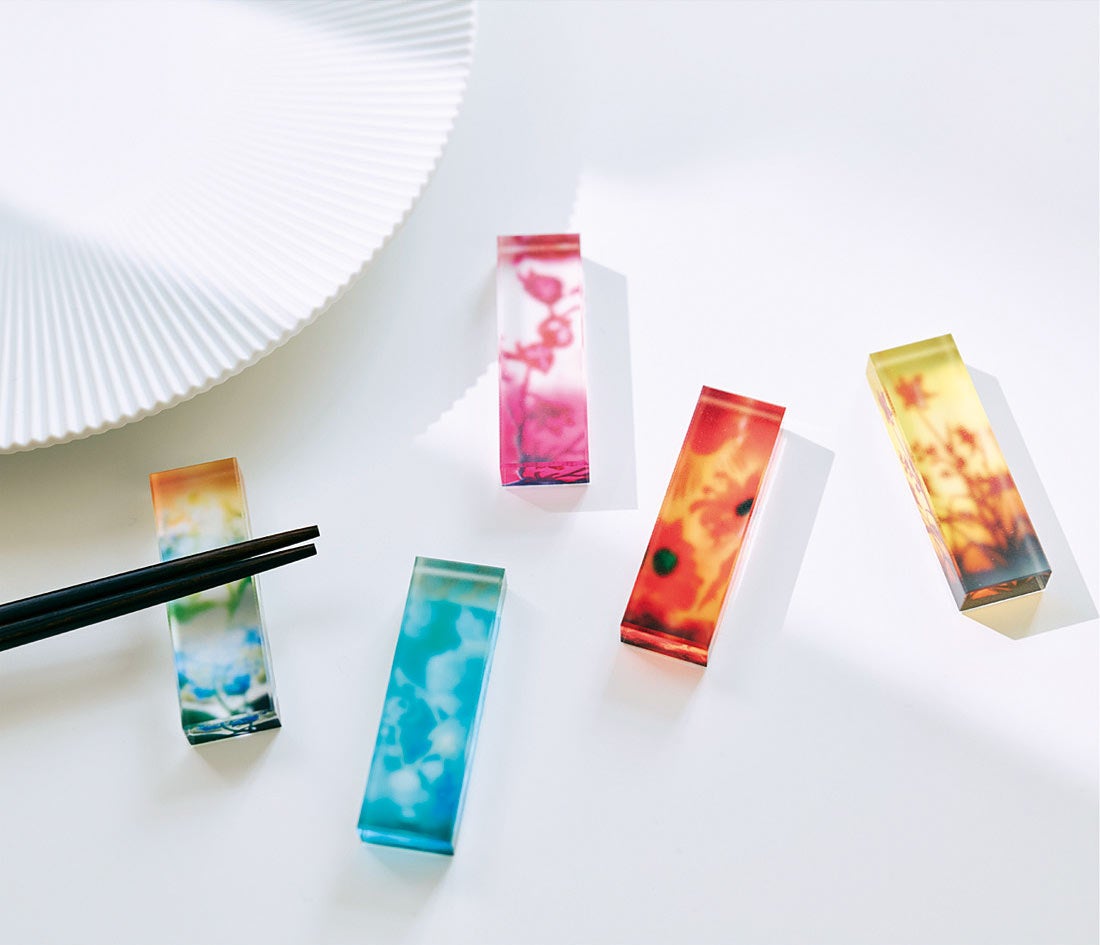 食卓を彩るアートなカトラリーレストです。ミュージアム部により厳選されたエミール・ガレの5つの作品をアクリルブロックにプリントしています。優雅な食事のひとときを演出する箸置きとしてだけでなく、そのままアートなインテリアとしても楽しむことができます。