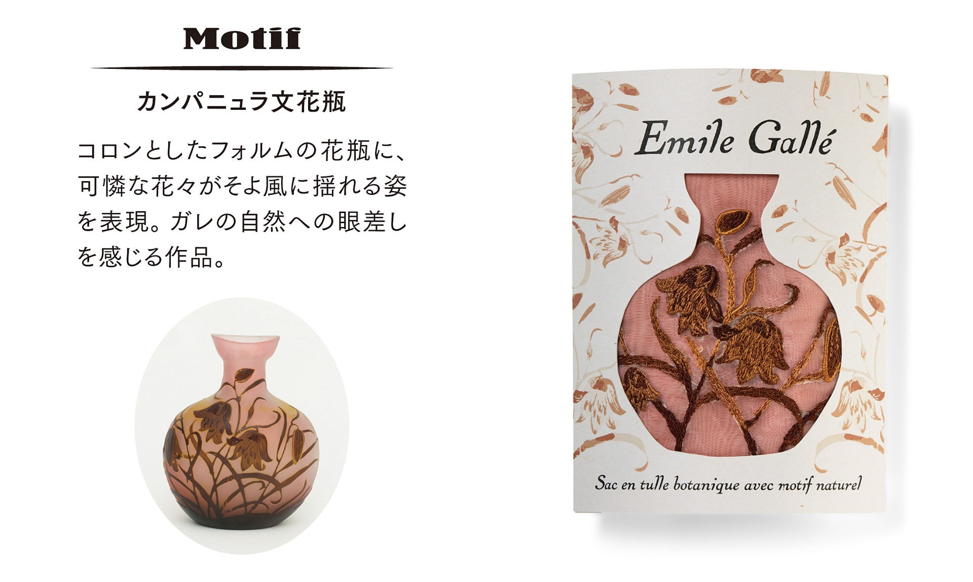 多様な自然の美しさを見つめ続け、自然の造形美を表現したエミール・ガレの作品が落とし込まれたチュールバッグです。ベースのガラスをイメージしたオーガンジー生地に、モチーフになっているカンパニュラの刺しゅうで淡くやわらかな光の質感を表現しています。
