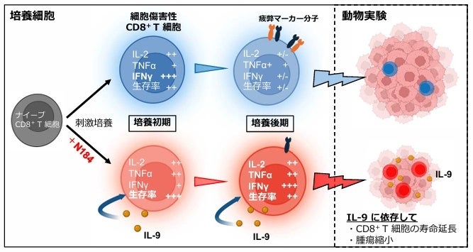 CD8 T細胞の刺激培養時にN184を共存させるとインターロイキン9(IL-9)産生細胞へと分化し、寿命が延長すると同時に、免疫疲弊分子の発現を抑制してインターフェロンγ(IFNγ)、インターロイキン2(IL-2)、腫瘍壊死因子(TNFα)の産生を増強し、且つ、抗アポトーシス分子を誘導してCD8 T細胞の細胞死を防ぐことを明らかにしました。