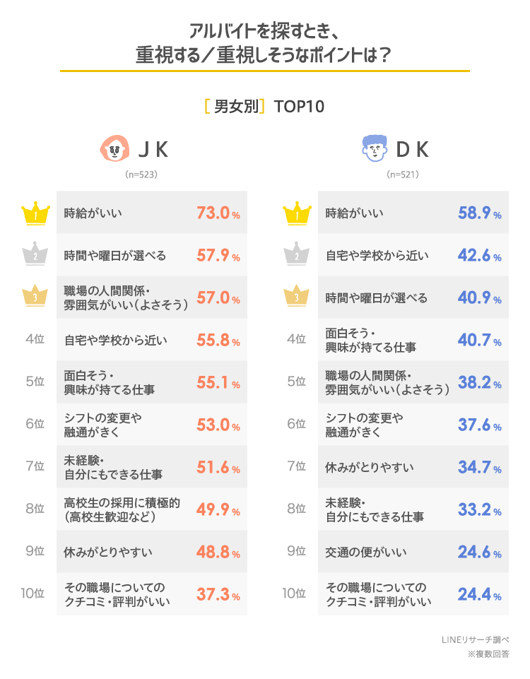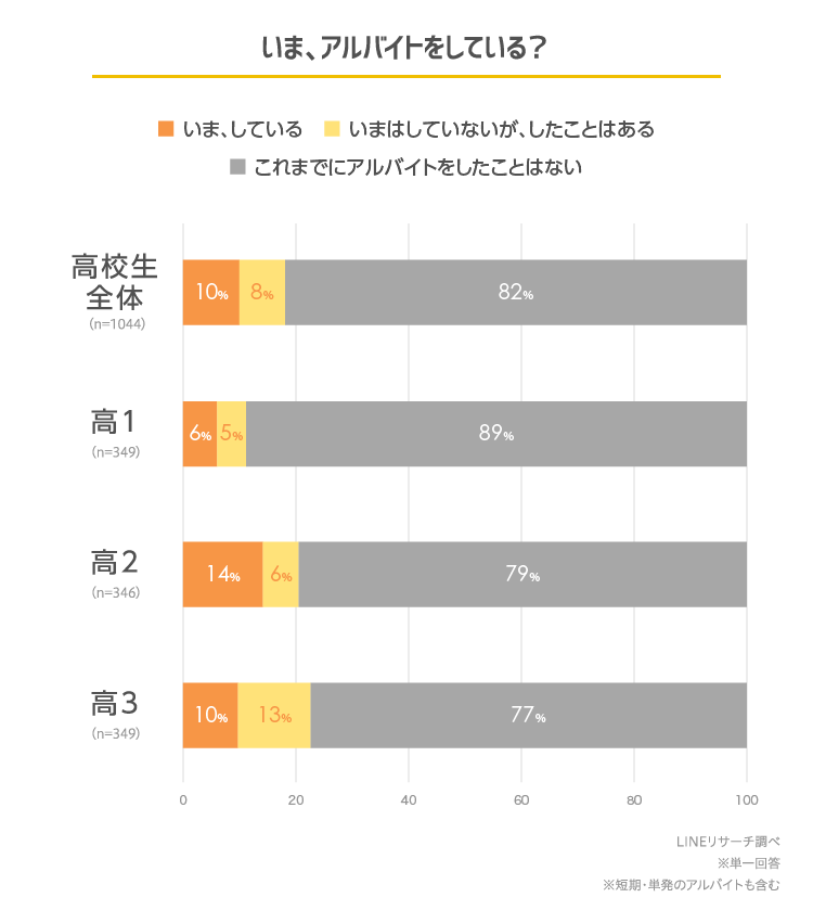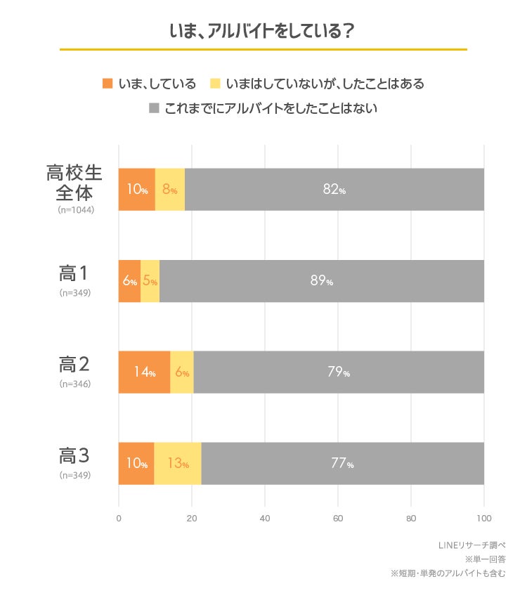 このたびLINEリサーチでは、日本全国の高校生を対象に、アルバイトの経験の有無やアルバイト探しで重視する点などについて調査しましたので、結果をお知らせいたします。