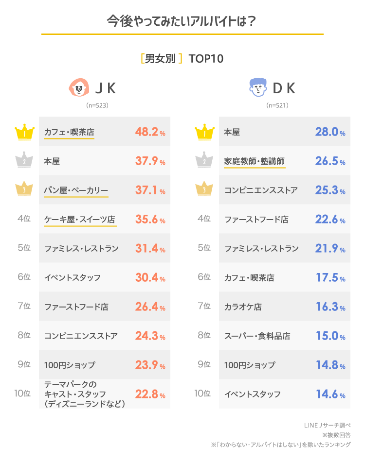 一方男子高生では、「本屋」「家庭教師・塾講師」が上位という結果となりました。