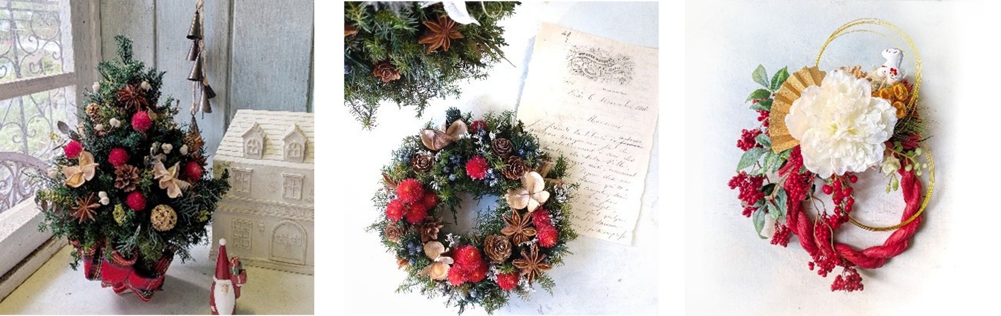 クリスマス、お正月にむけて、枯れないお花プリザーブドフラワーやドライフラワー、アーティフィシャルフラワーでクリスマスリース、ツリー、お正月のしめ縄飾りなどをご用意しました。