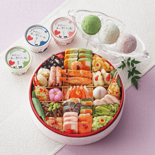 【商品特長】宝石箱をイメージし、メニューを彩りよく盛り合わせたお重です。デザートにこだわりのアイスを添付しました。
