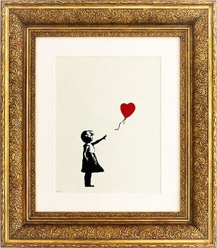 本美術館で展示している「風船と少女」は2004年に制作された150点のうちのひとつで、関係者への販売時のみ入れられるハートマーク付きのサインが作品左下に施されている、大変希少性の高い作品と言われています。額装は、2018年に「サザビーズロンドン」で開かれたオークションにおけるシュレッダー事件の額装を忠実に再現しています。
