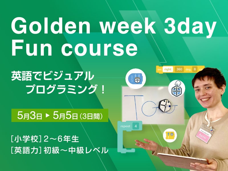 「Golden week 3day Fun course~英語でビジュアルプログラミング!~」では、ロボット掃除機“ルンバ”にそっくりなプログラミングロボット“Root(ルート)”を使って、文字や図形を描くことに挑戦します。さらにタッチボタンを使ったプログラミング体験や、自分でデザインした迷路の中でのRootの動きの観察など、Golden Week限定の特別企画を多くご用意おります。プログラミングでさらなる創造力を養うことのできる、充実の連休を過ごすことができます。すべての英語レベルのお子様にご体験いただけます。