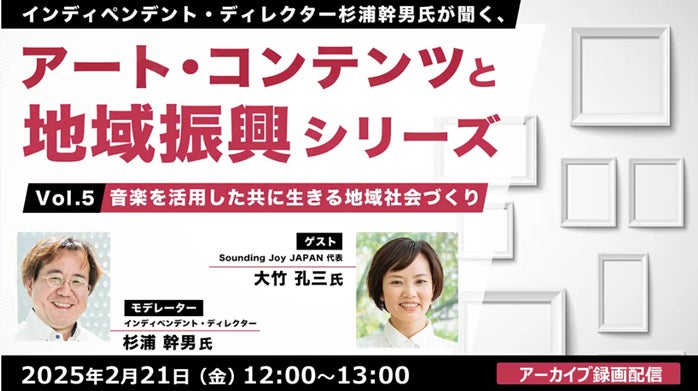 【自治体職員・クリエイター向け】文化芸術政策のプロ・杉浦幹男氏が聞く!音楽を活用した地域づくりとは?2/21(金)「アート・コンテンツと地域振興シリーズ vol.5」のアーカイブ映像を無料配信!