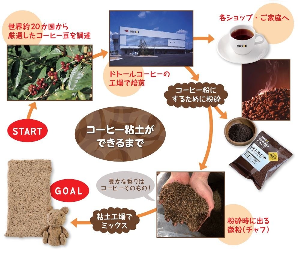 ドトールコーヒーの研究・開発によって作られたコーヒー粘土は、自社工場で焙煎したコーヒー豆を粉砕する際に出る微粉(チャフ)が練り込まれており、コーヒーの香り豊かな粘土に仕上がりました。本来廃棄されるチャフは、近年堆肥や肥料などにリユースされていますが、それを子ども達が大好きな粘土の材料に使用することで、知育に貢献できるエコロジーなアイテムに生まれ変わりました。子どもたちが一層リサイクルや食べ物に興味をもつきっかけになることでしょう。