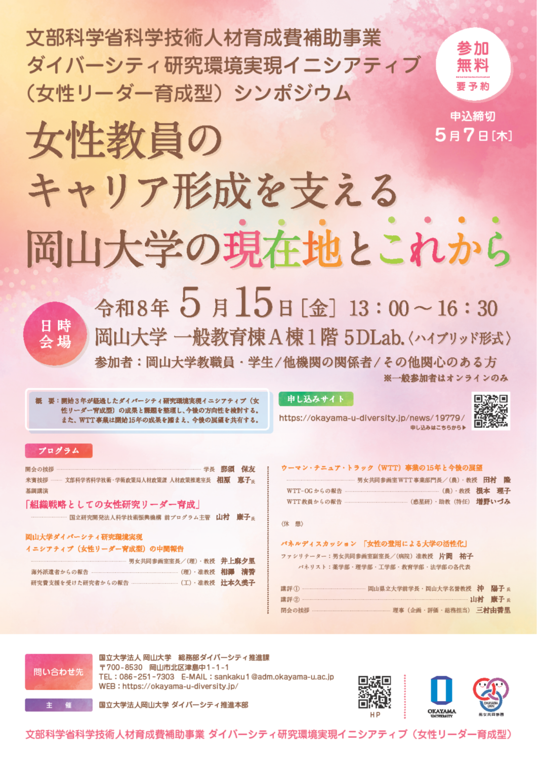 【岡山大学】ダイバーシティ研究環境実現イニシアティブ(リーダー育成型)シンポジウム-女性教員のキャリア形成を支える岡山大学の現在地とこれから-〔5/15,金 オンライン開催〕