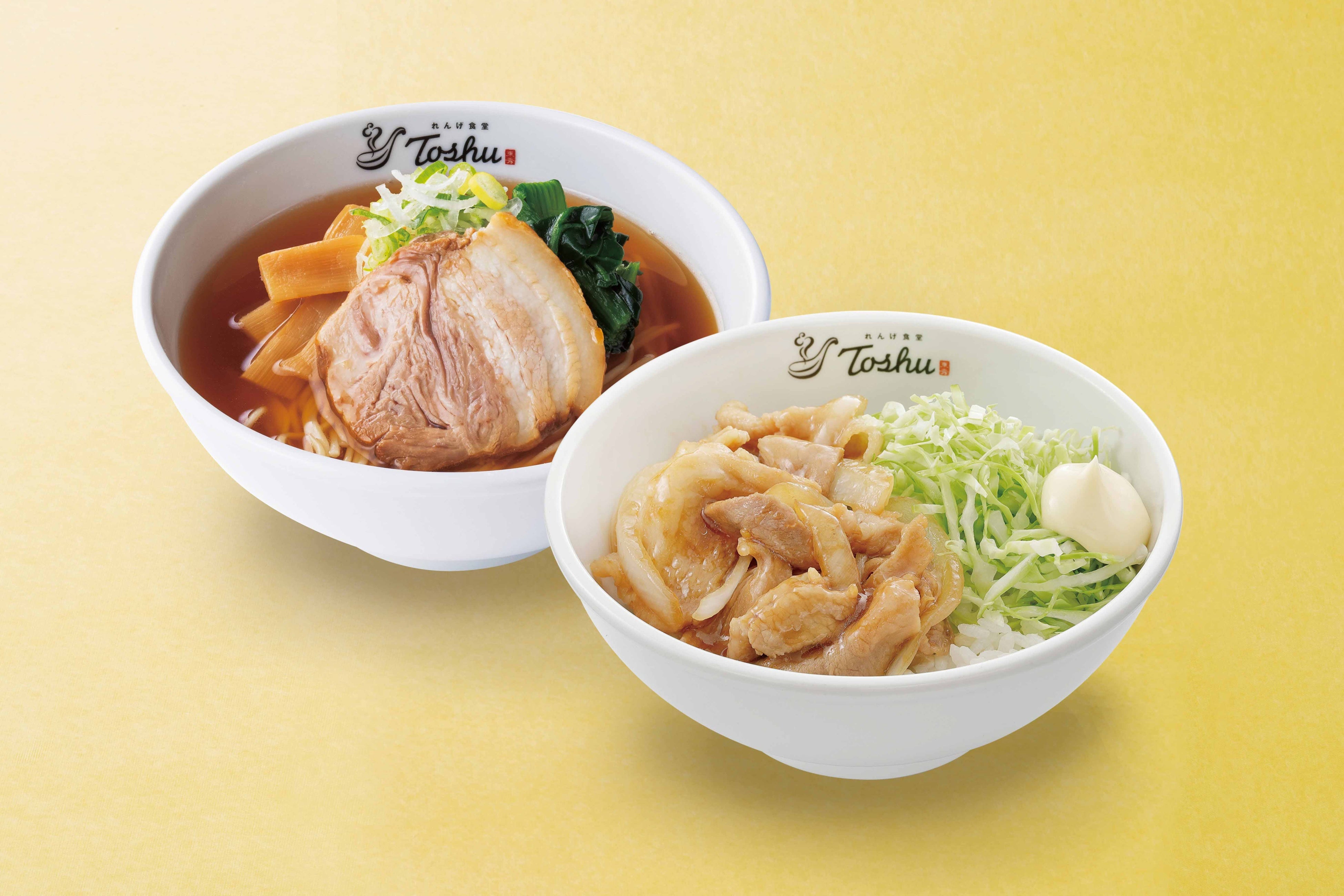 ・東秀人気の『生姜焼き』半食分をライスの上にドーンとのせたミニ生姜焼き丼と半ラーメンがセットになった「ランチミニ生姜焼き丼セット」