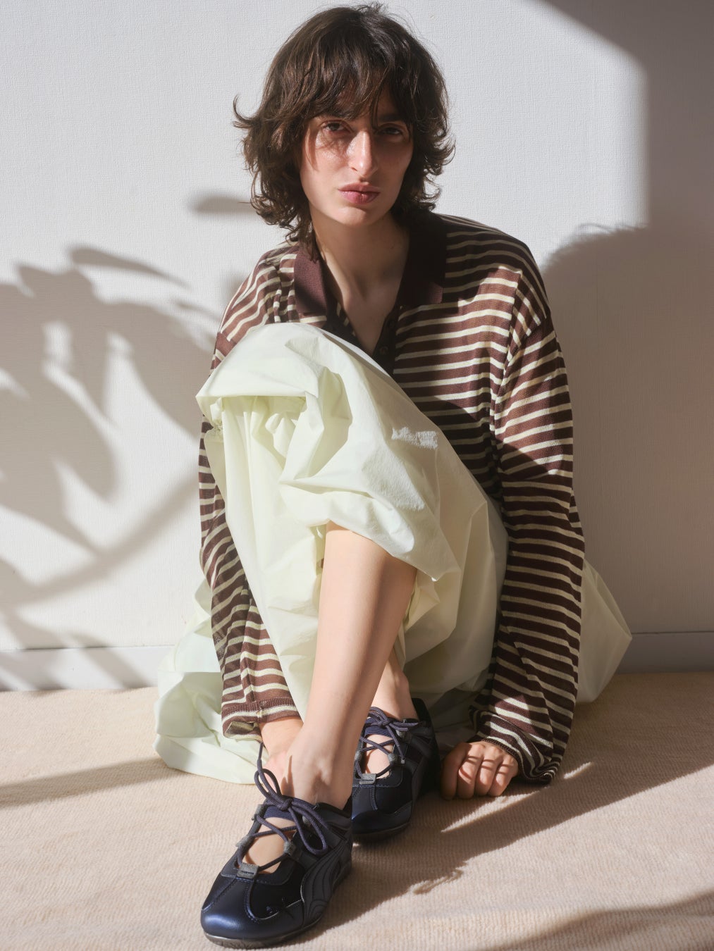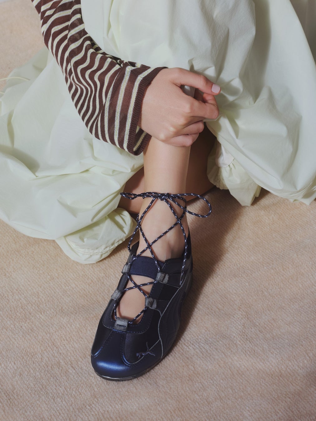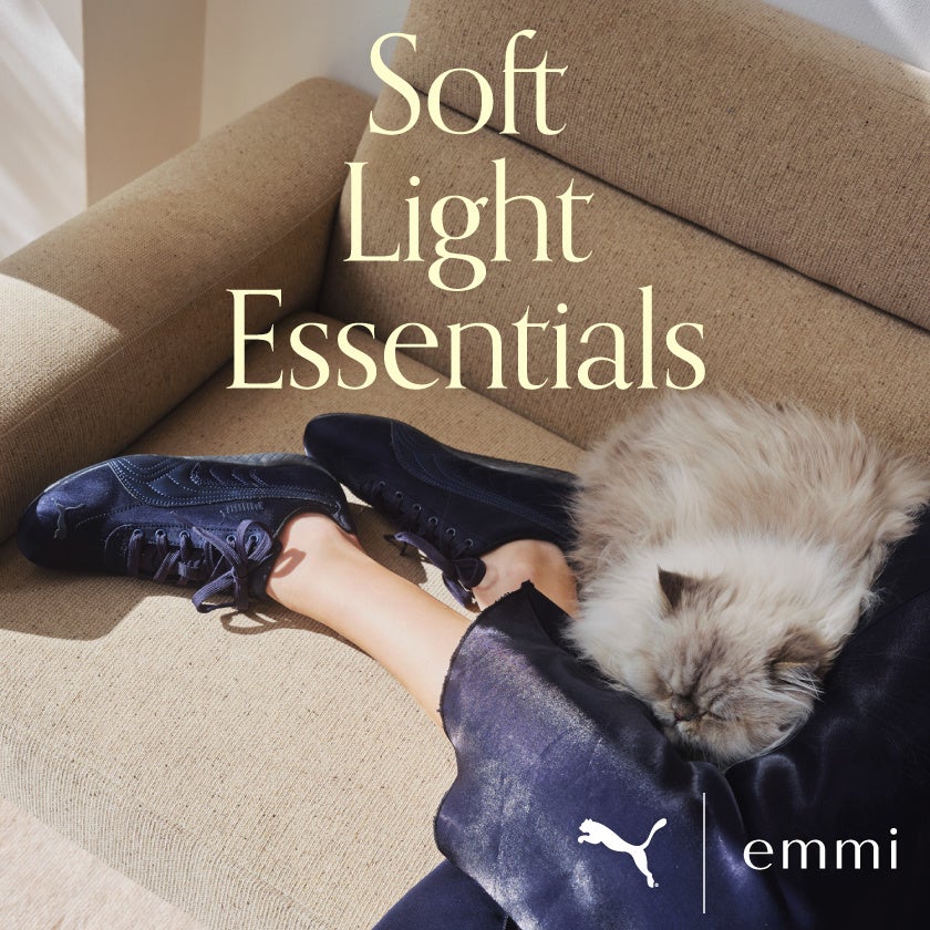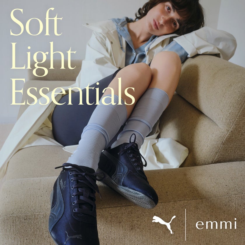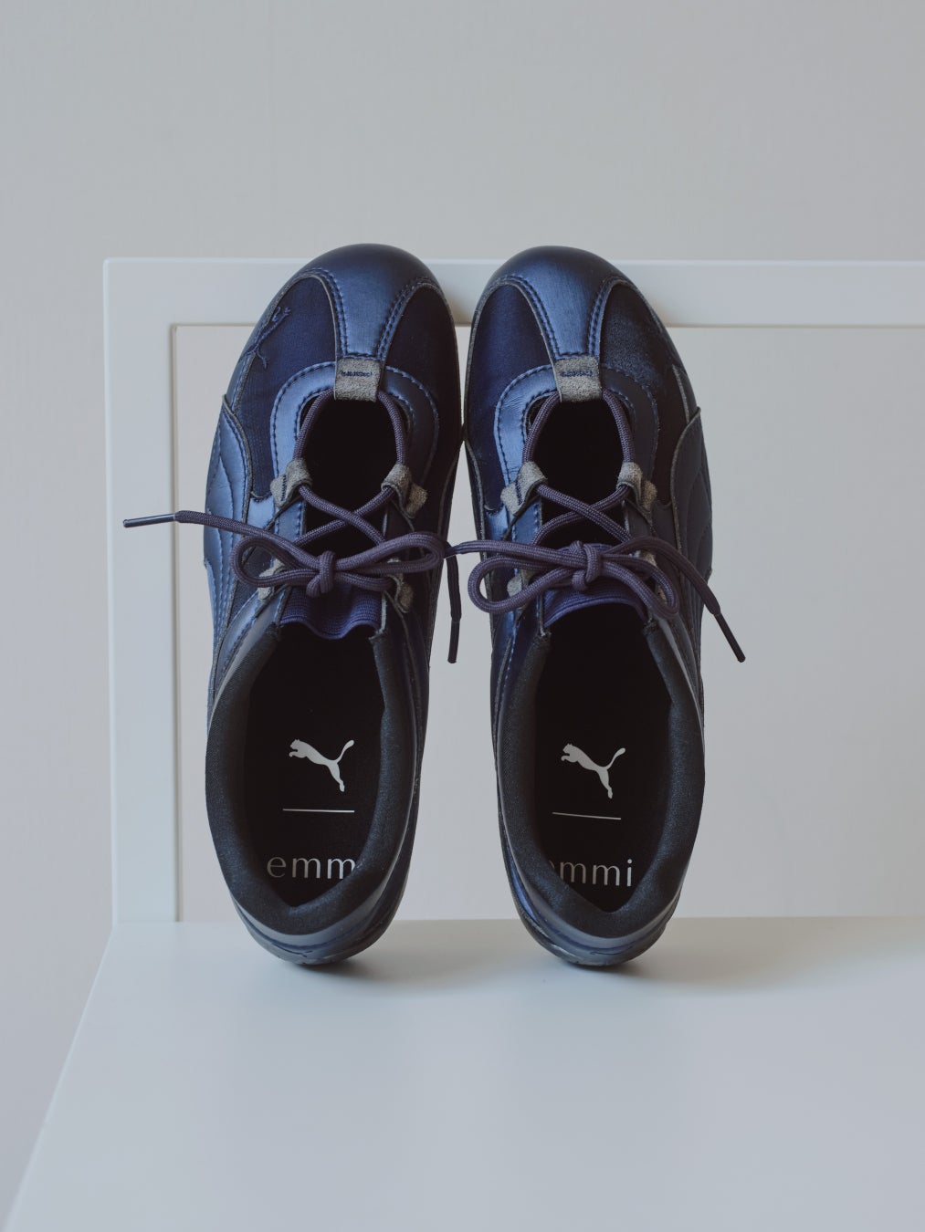 スピードキャット・ゴーは、レーシングカルチャーのアイコンであるプーマスピードキャットをベースに、シュータンのないシューレース構造で、通気性を高めています。アッパーは艶感のあるシックなネイビーをベースに、アウトソールにはマーブル調のデザインを。オプショナルシューレースは、バレエシューズのように足首まで巻ける長さがあり、軽やかでトレンドライクな足元を演出します。今シーズンより、フットベッドにもemmiロゴが入った特別仕様に。