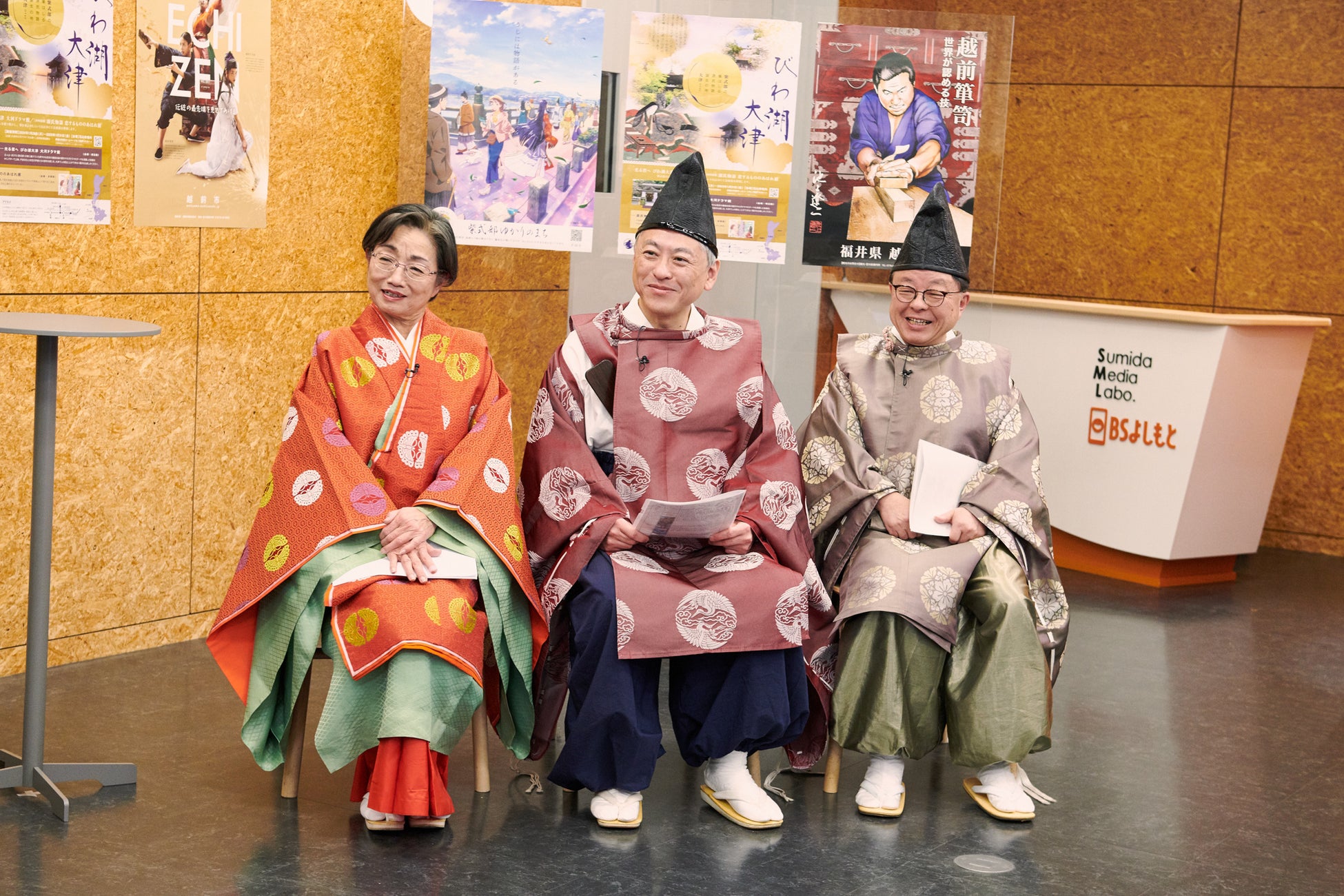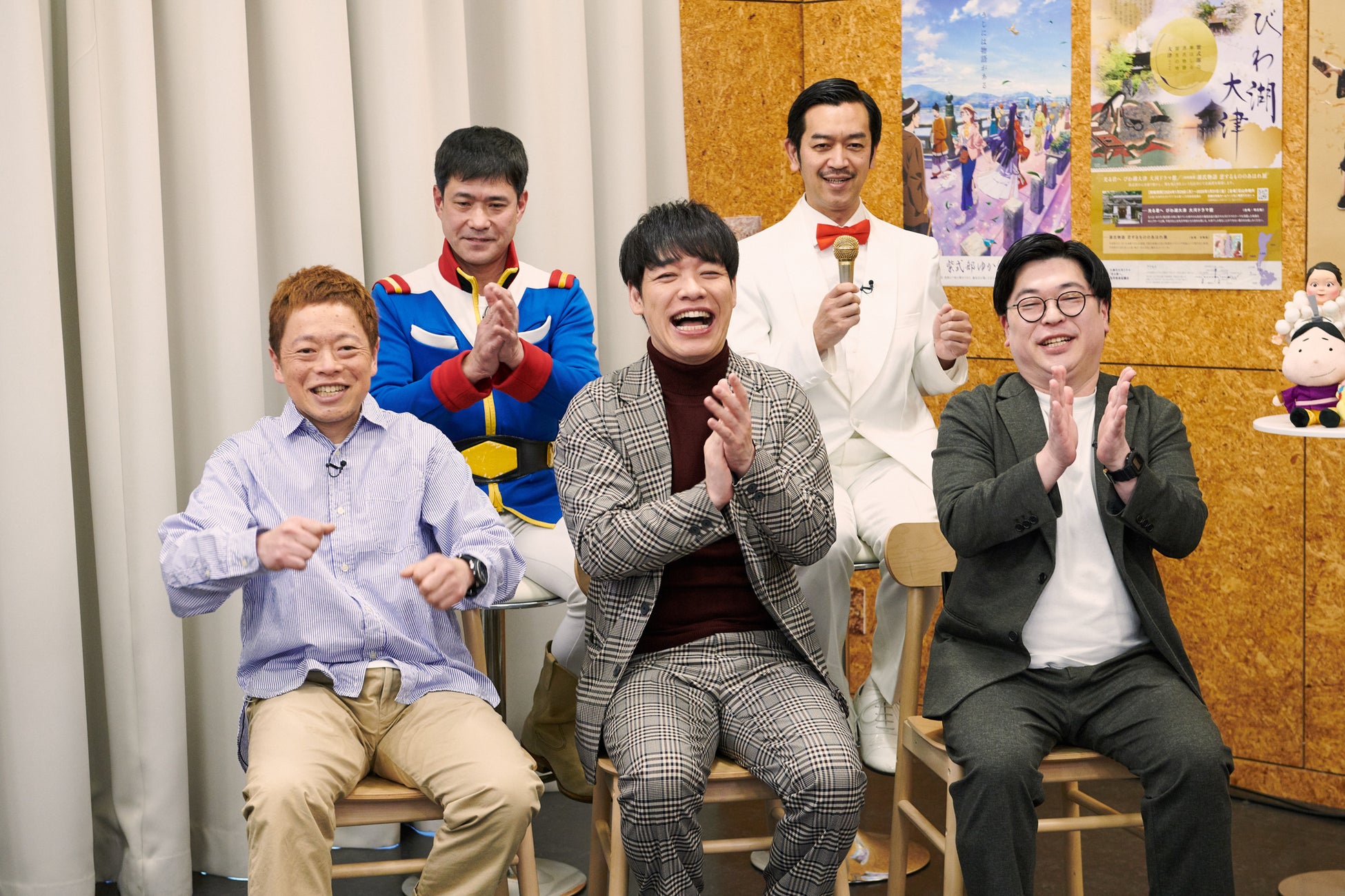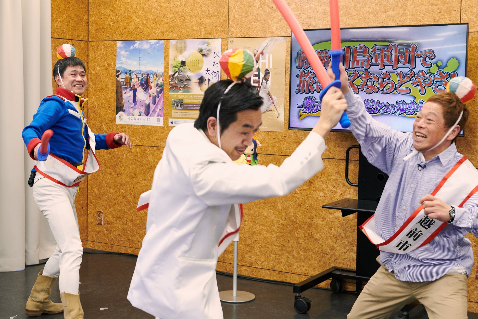 スタジオに登場した平安時代の衣装を身にまとった3名は、滋賀県大津市、京都府宇治市、福井県越前市の市長たち。市長自ら、 自分たちの市をPRします。それぞれの市が紫式部とどのようなつながりがあるのかという歴史的な知識も学べるのが番組のポイント。隙 あらば自らの市の優っているところをアピールする3市長の姿を見た天津飯大郎は、「想像よりバチバチですね(笑)」と言って笑いを 取ります。