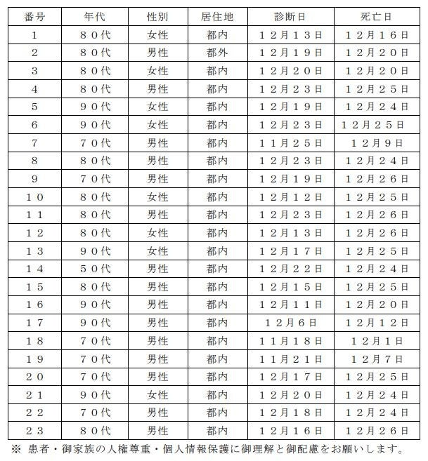 都内で新型コロナウイルスに感染した方が死亡されましたのでお知らせします。