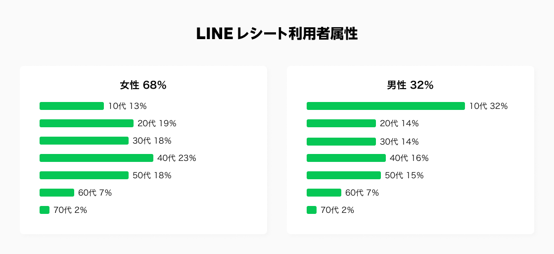 登録されたレシートの業種としては、「コンビニ」「スーパー」「ドラッグストア」で50%以上のシェアを占め、利用者の属性としては、ご利用の約7割が女性で、40代のユーザーを中心にご利用いただいていることから、レシートを撮影するだけで簡単に支出管理ができる「LINEレシート」が、家庭をもつ主婦層を中心にご利用いただけていることが想定できます。