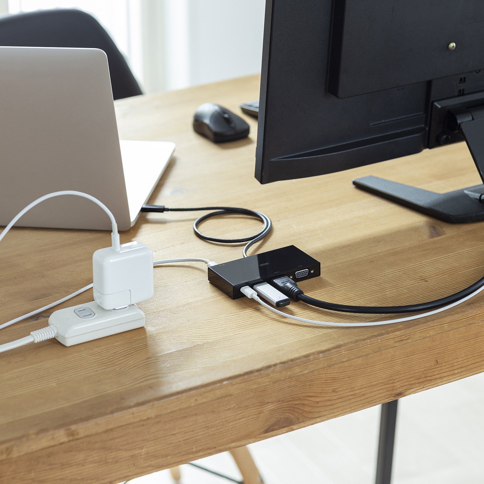 「AD-ALCMHV2BK」は、Type-Cポート搭載のノートパソコンからHDMIやVGA搭載の外部ディスプレイへ接続できるマルチ変換アダプタです。