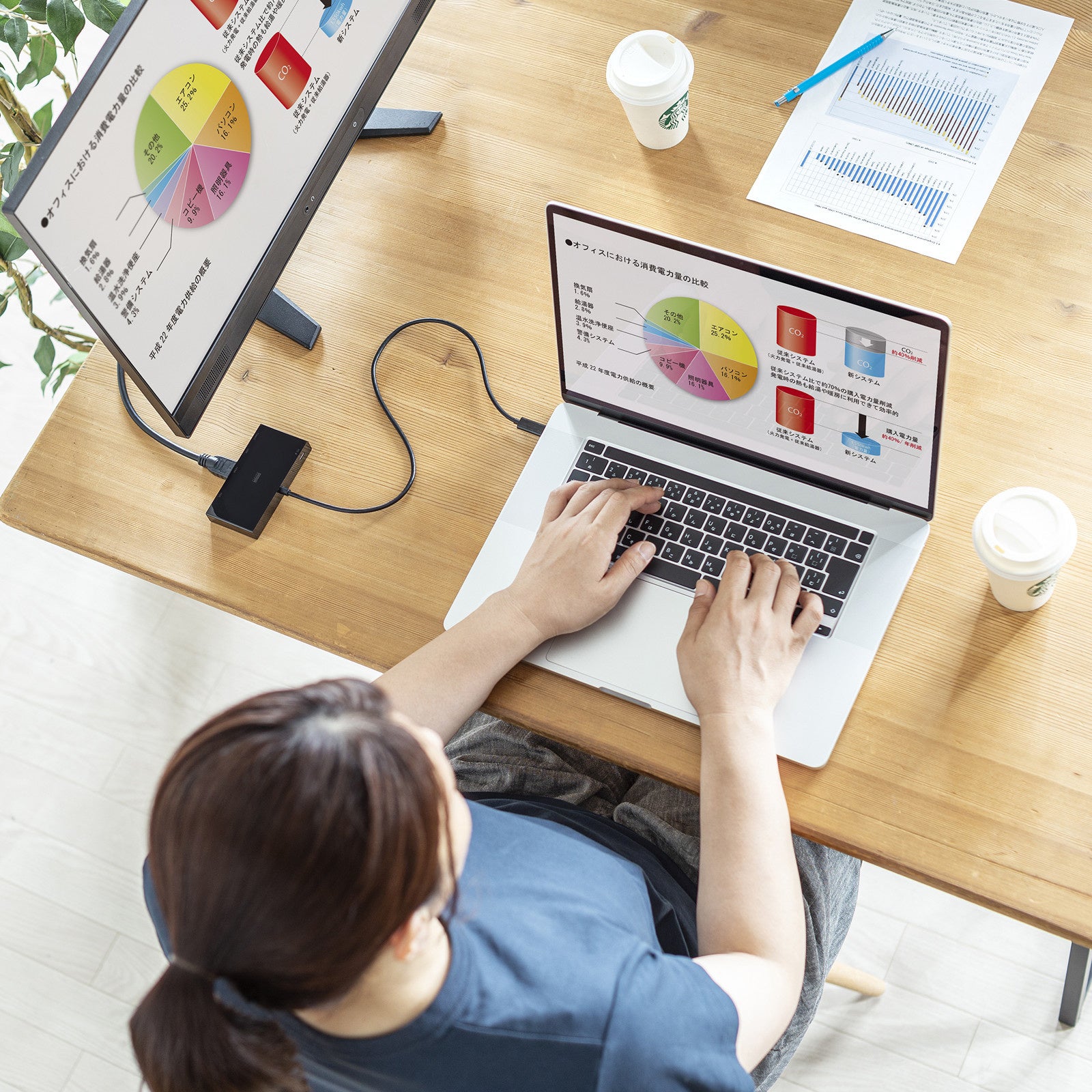 在宅ワークや移動先でも、ノートパソコンから大きいディスプレイに出力が可能になります。ノートパソコンの画面を拡張して広い画面で作業したり、ミラーモードでのプレゼンにも便利です。