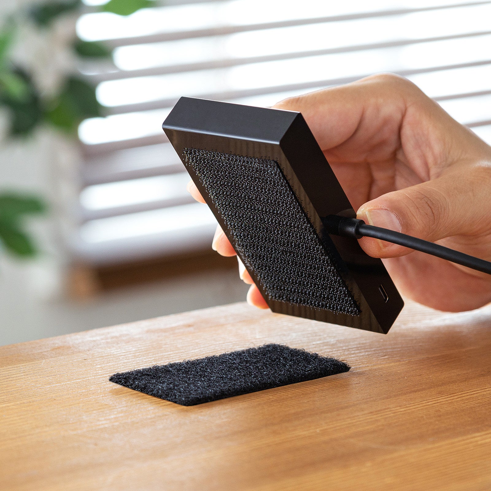 また、付属の面ファスナーを使い、机などの設置したい場所に固定すれば、配線によって本体が浮いたり動いたりするのを防げます。