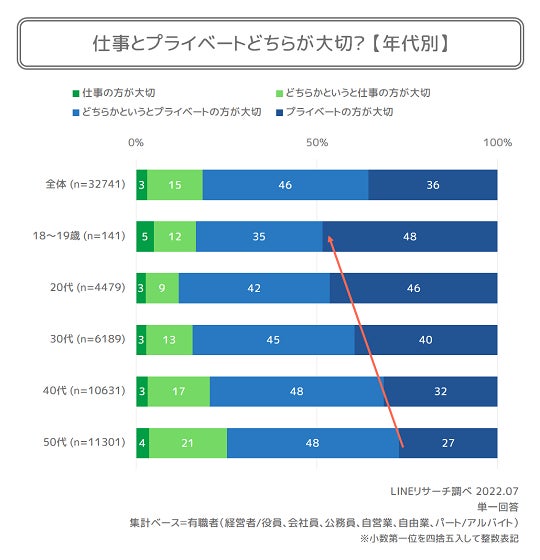 年代別でみると、若年層ほど「プライベートの方が大切」の割合が高くなる傾向にありました。また、年代が上がるほど「どちらかといえばプライベートが大切」「どちらかといえば仕事が大切」の割合が高くなりました。