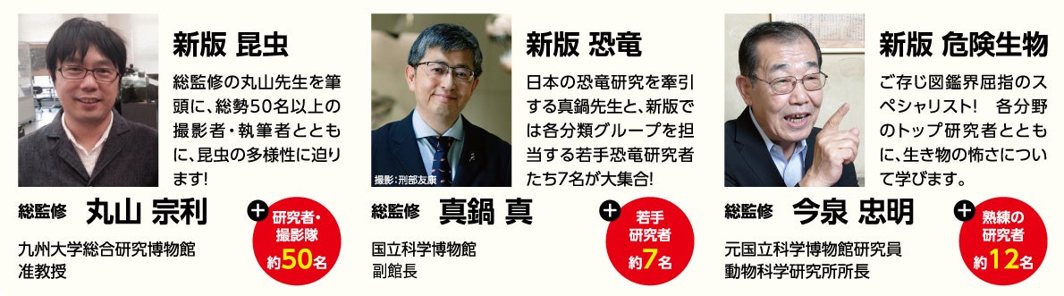章ごとに専門家を配置。総監修の国立科学博物館副館長 真鍋真先生と30~40代の若手研究者チームで、現在の研究現場の最前線の情報を提供。