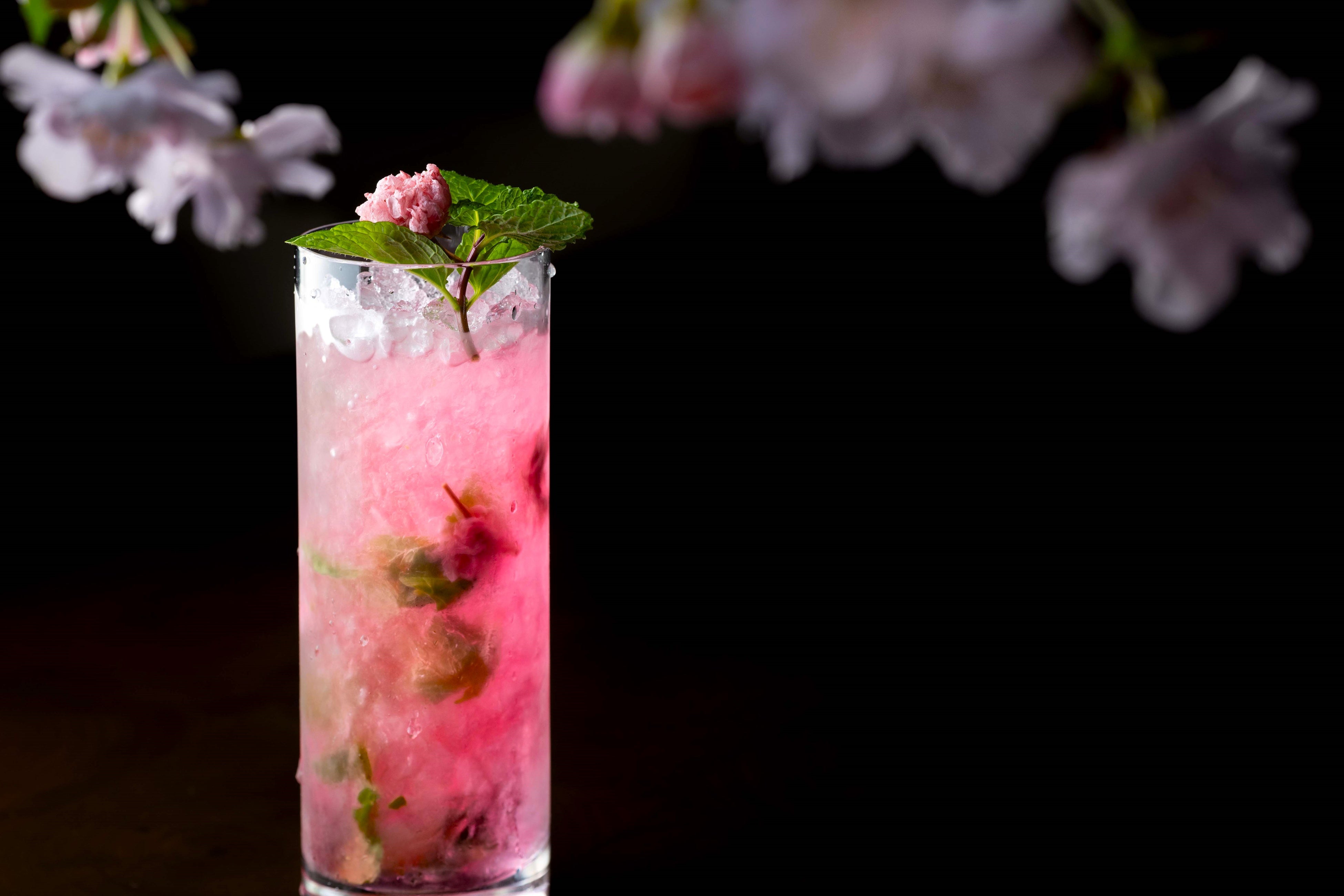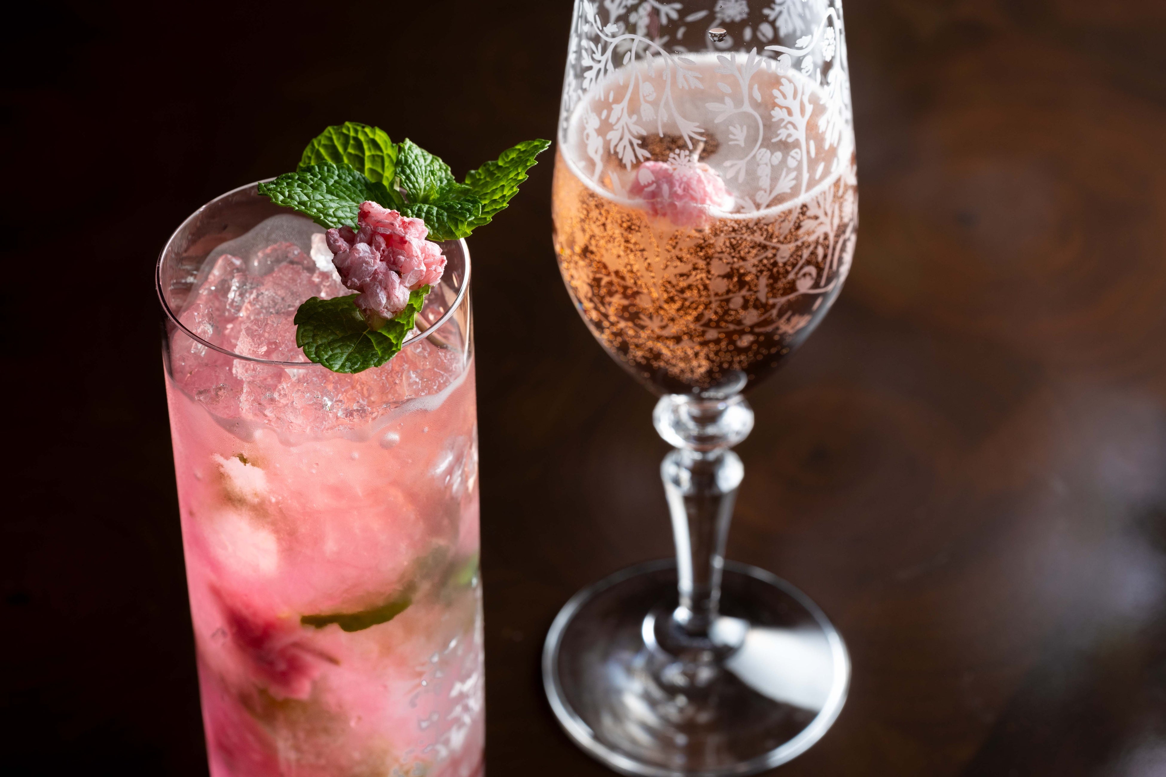 桜が花開く優雅な季節にふさわしく、淡い紅色のカクテル2種がバーの空間を華やかに彩ります。フレッシュミントの清涼感に桜のエッセンスが溶け込んだ「桜モヒート」、桜のリキュールがシャンパンにロゼ色の輝きを添える「桜ロワイヤル」。いずれのカクテルにも、春の訪れを告げる桜の漬け花を浮かべ、グラスの中に広がる上品な香りと色彩が、季節の情緒を静かに映し出します。