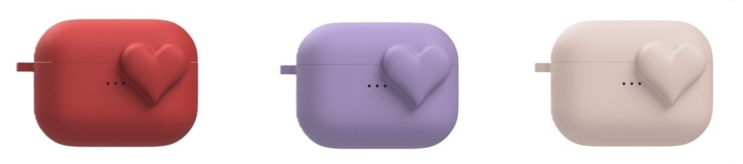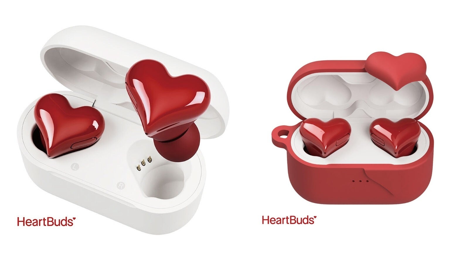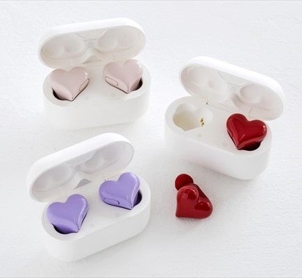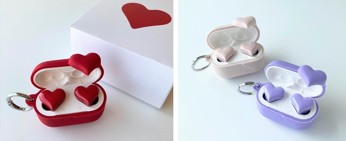 ケースカバーなしの通常バージョンのハートのワイヤレスイヤホン(画像左)と、イヤホンの白いケースにぴったりフィットするレッドのケースカバーがセットになった数量限定特別バージョン(画像右)