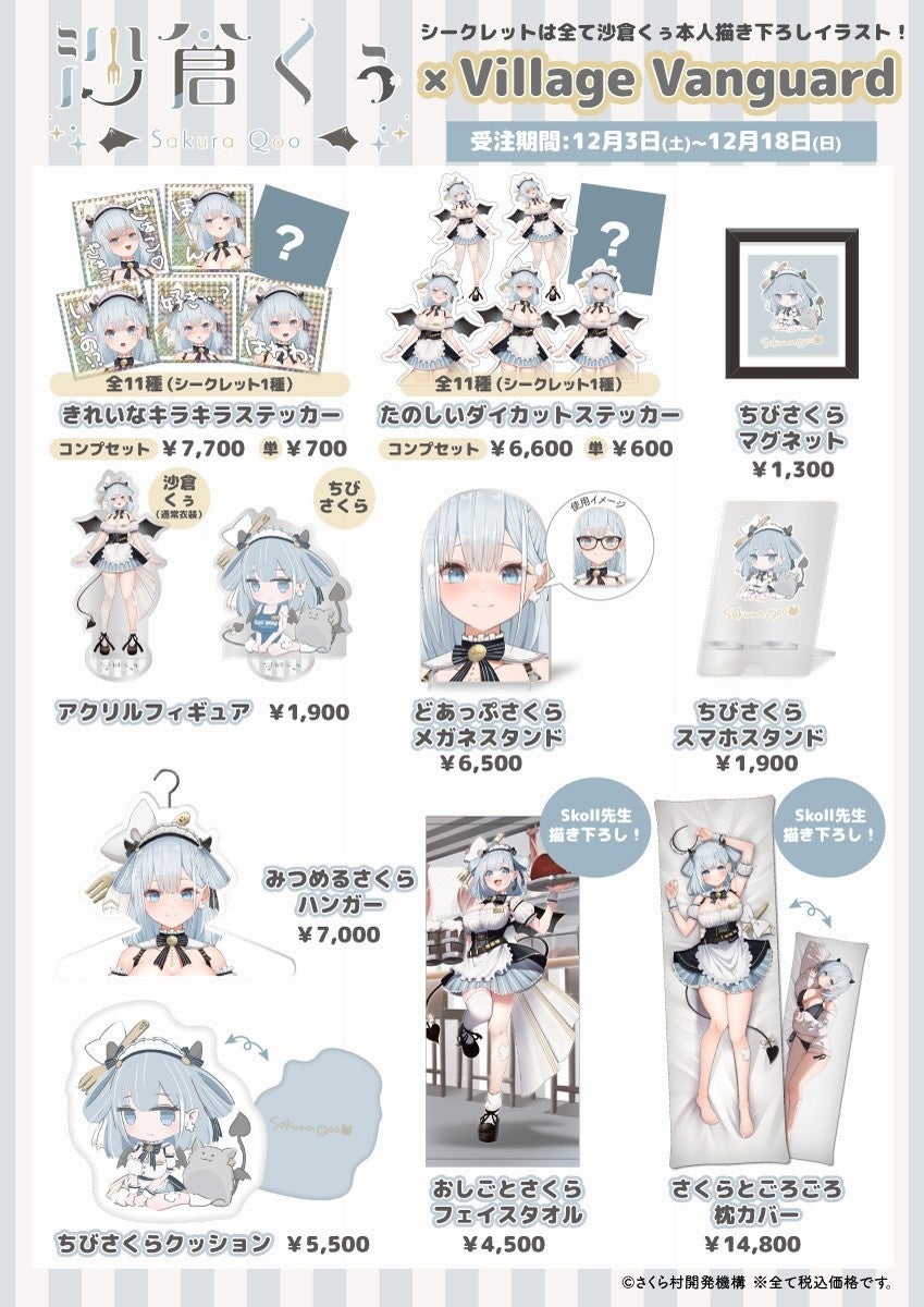 2022年11月25日(金)より、期待の新人Vtuber【沙倉くぅ】とヴィレッジヴァンガードのコラボグッズが発売決定!可愛いイラストデザインで、グッズの種類もたくさん!ランダム商品のシークレットは全て沙倉くぅ本人描き下ろしイラストを使用!期間限定のオンライン受注販売のみになりますのでお見逃しなく!