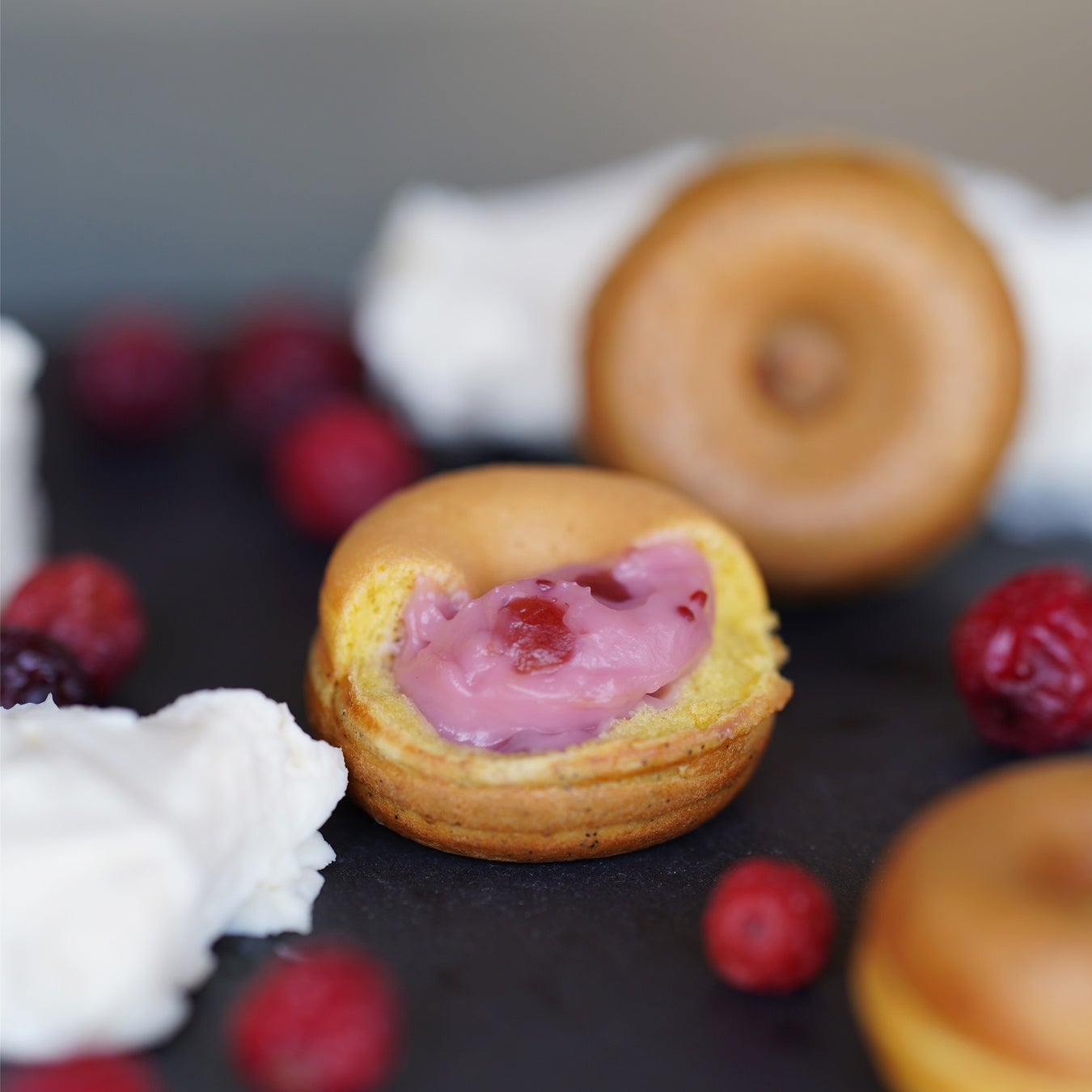 クランベリーの果実に、クリームチーズでコクを出した、ちょっぴり甘酸っぱい味わいの爽やかなフルーツクリームを、プレーン生地と紅茶生地で包み焼き上げました。