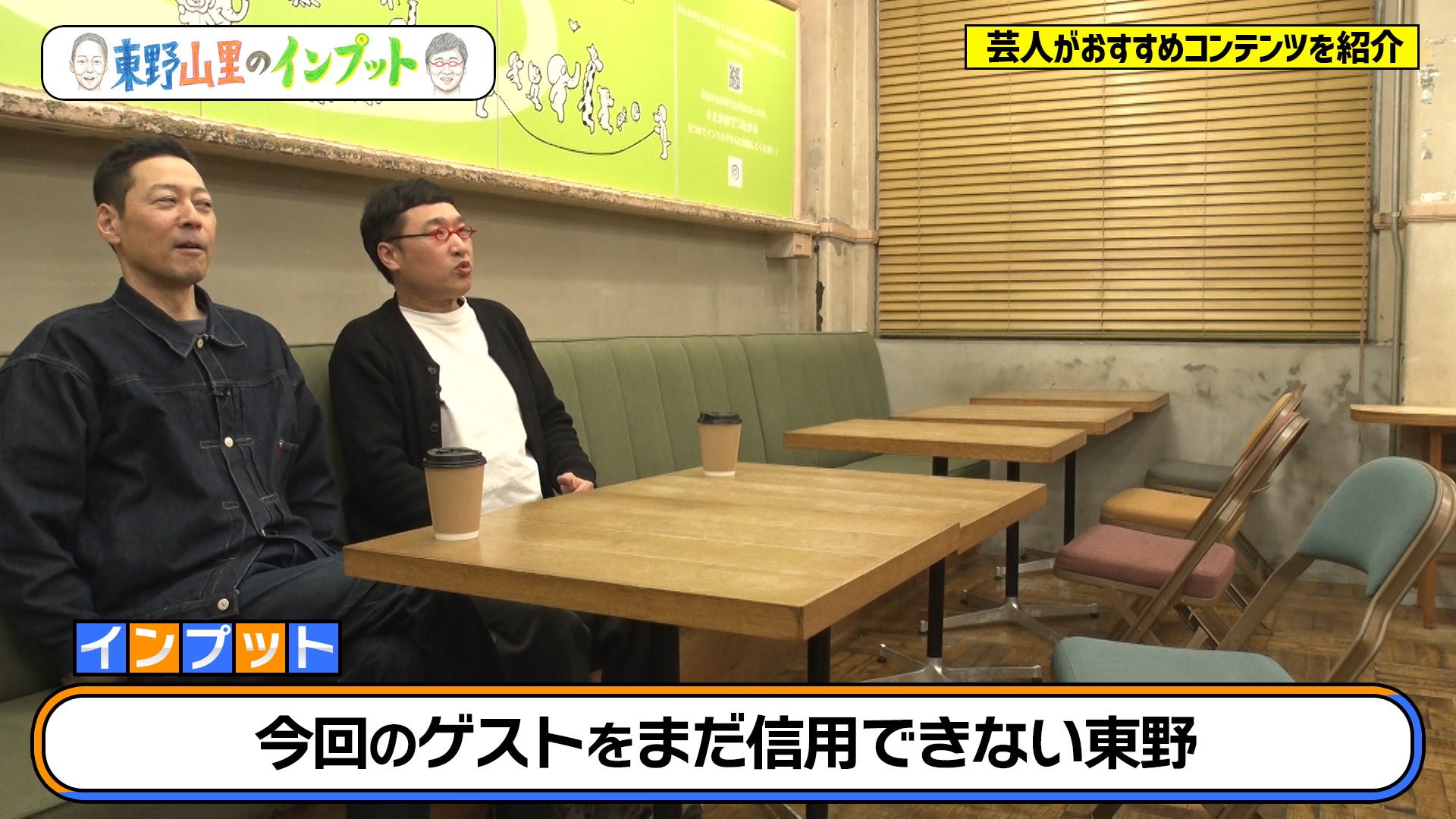 オープニングトーク。東野は「毎回インプットさせてもらって、こんなええ番組ないんやけど……今回のゲスト不安なのよね」、「多分、確信持ってブッキングしてるから大丈夫だと思うけど、俺まだ信用してないねん」、「吉本のなかで数名危ないヤツやと思ってるひとりやねん」とこぼします。“何に”とは言わないものの、不安を抱える東野に対し、山里は「テーマ次第だと思いますけどね」とフォローを入れます。