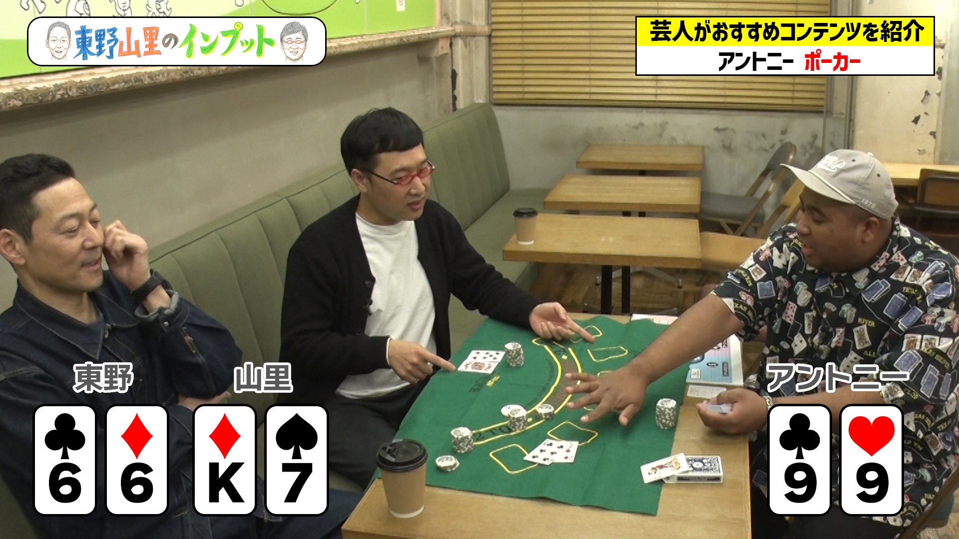 「麻雀とは違ってハッタリができる」、「テルと言われるクセが出てしまうことがある」など、ゲームを教えつつ、プレイヤーたちの心理合戦についても語ります。東野や山里もどんどんポーカーの魅力にハマって……。