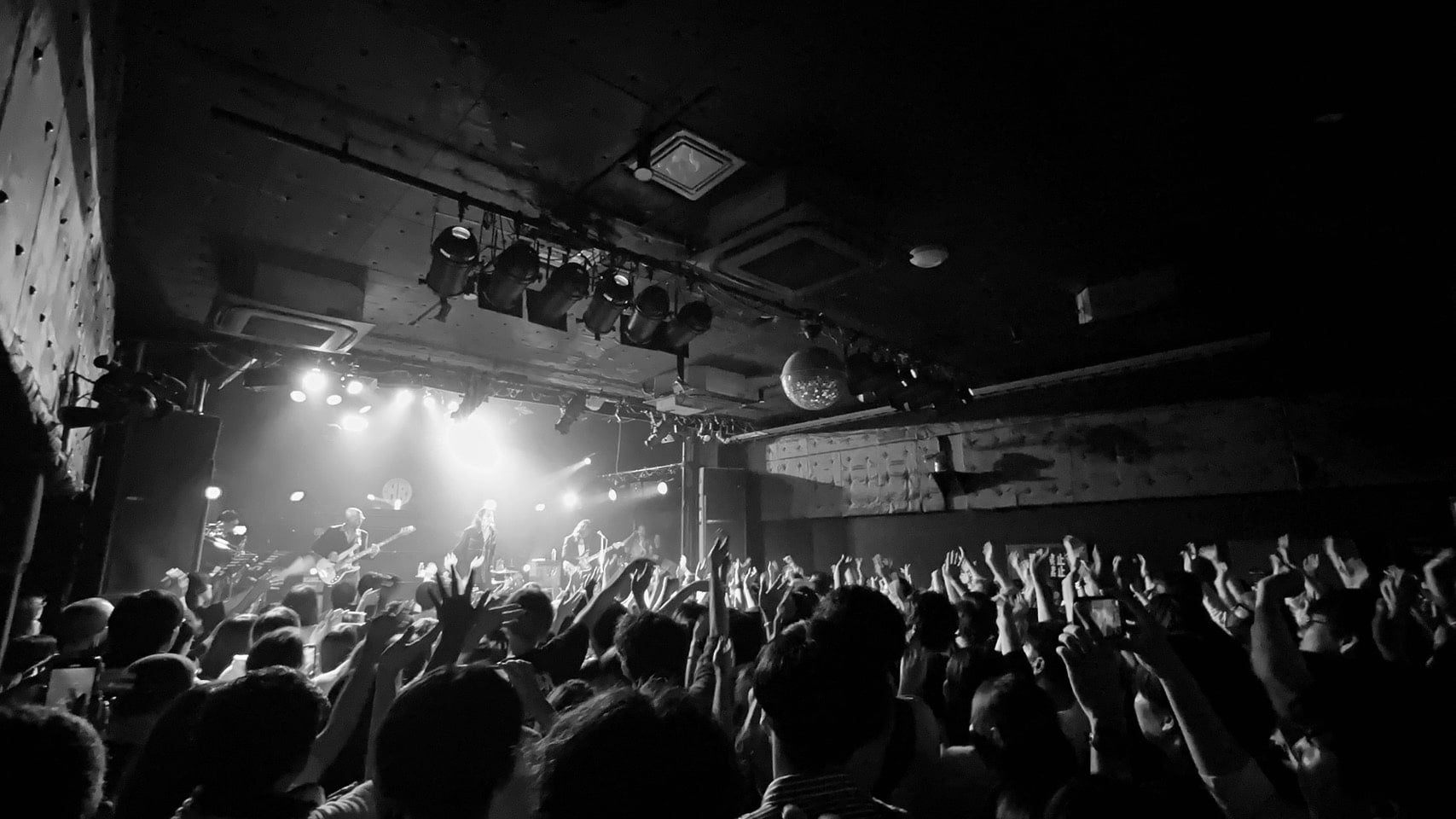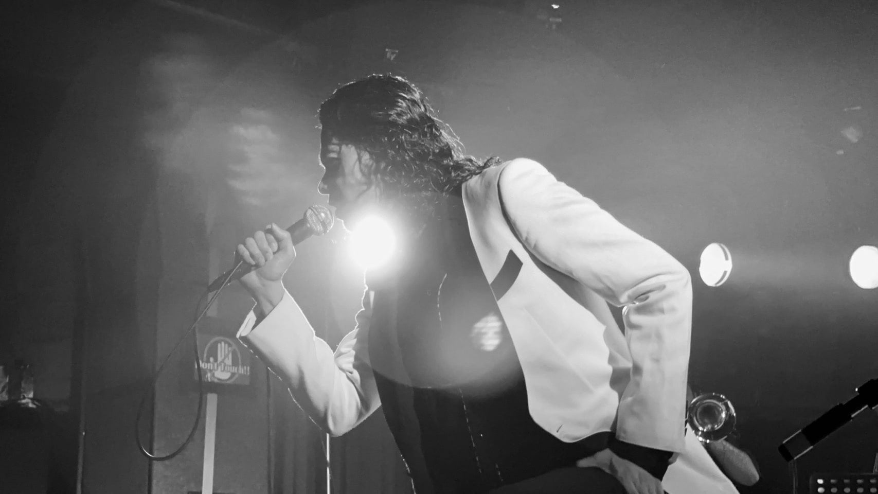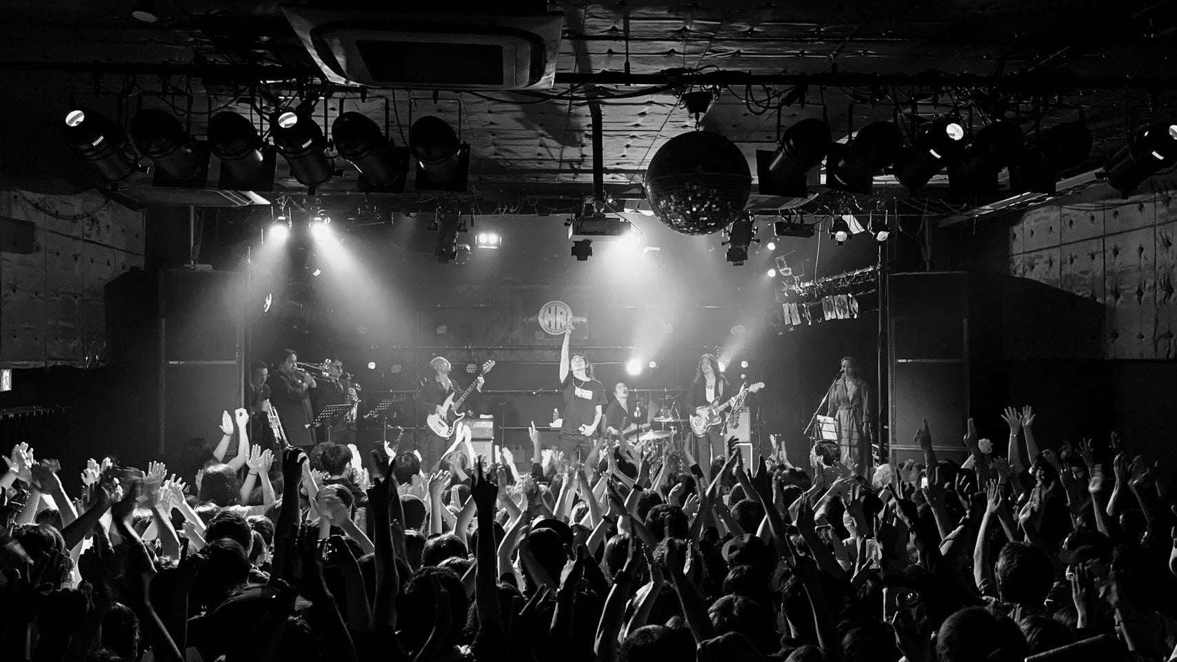 さて、この日の会場キャパシティは、およそ350名。フロアの広さは学校の教室を一回り大きくしたほどで、開演前から人も熱気もパンパンに詰まっていたし、なによりメンバーが目の前に迫り、誇張抜きで情熱をぶつけあえるほど、とんでもない至近距離である。もちろん、ステージの上も所狭し。下手から順に、あっきー(Tp.)、YOSHIO(Tb.)、黒川和希(Sax.)、BOBO(Dr.)、NADIA(Cho.)と、ALIの3名を入れて合計8名もが並んでいた。この規模のライブハウスではなかなか見ない光景だった。