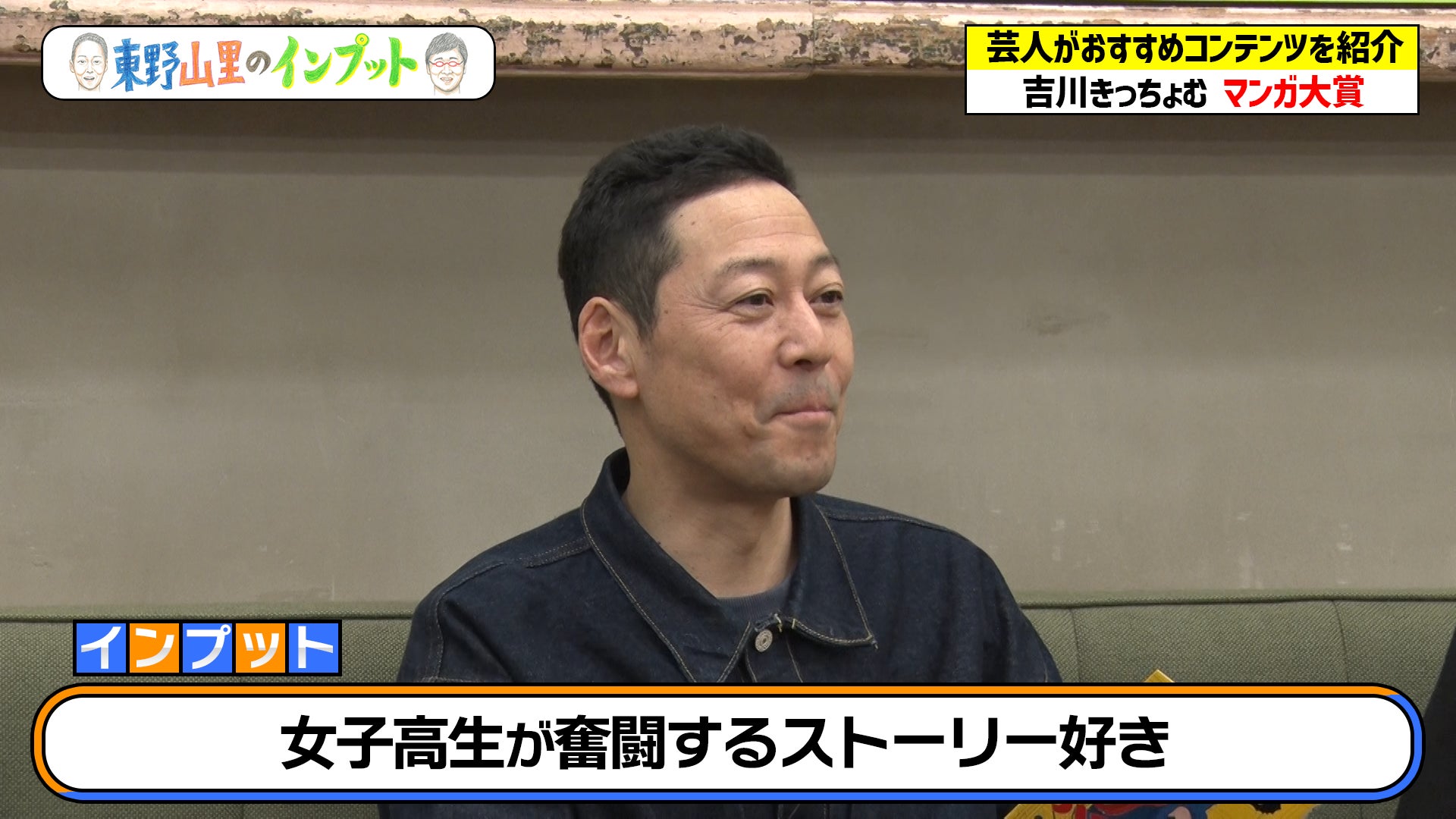 終盤には、毎月700作品をチェックしている吉川が、先輩芸人にLINEでおすすめマンガを教えている、という話に。東野や山里のLINEも教えてもらえればそれができる、と言われると、東野は「気味悪いLINEの聞き方やな」、「目的なんやねん!」とツッコミ。吉川は、あくまでたくさんの人にマンガを読んでほしいだけ、と弁明します。