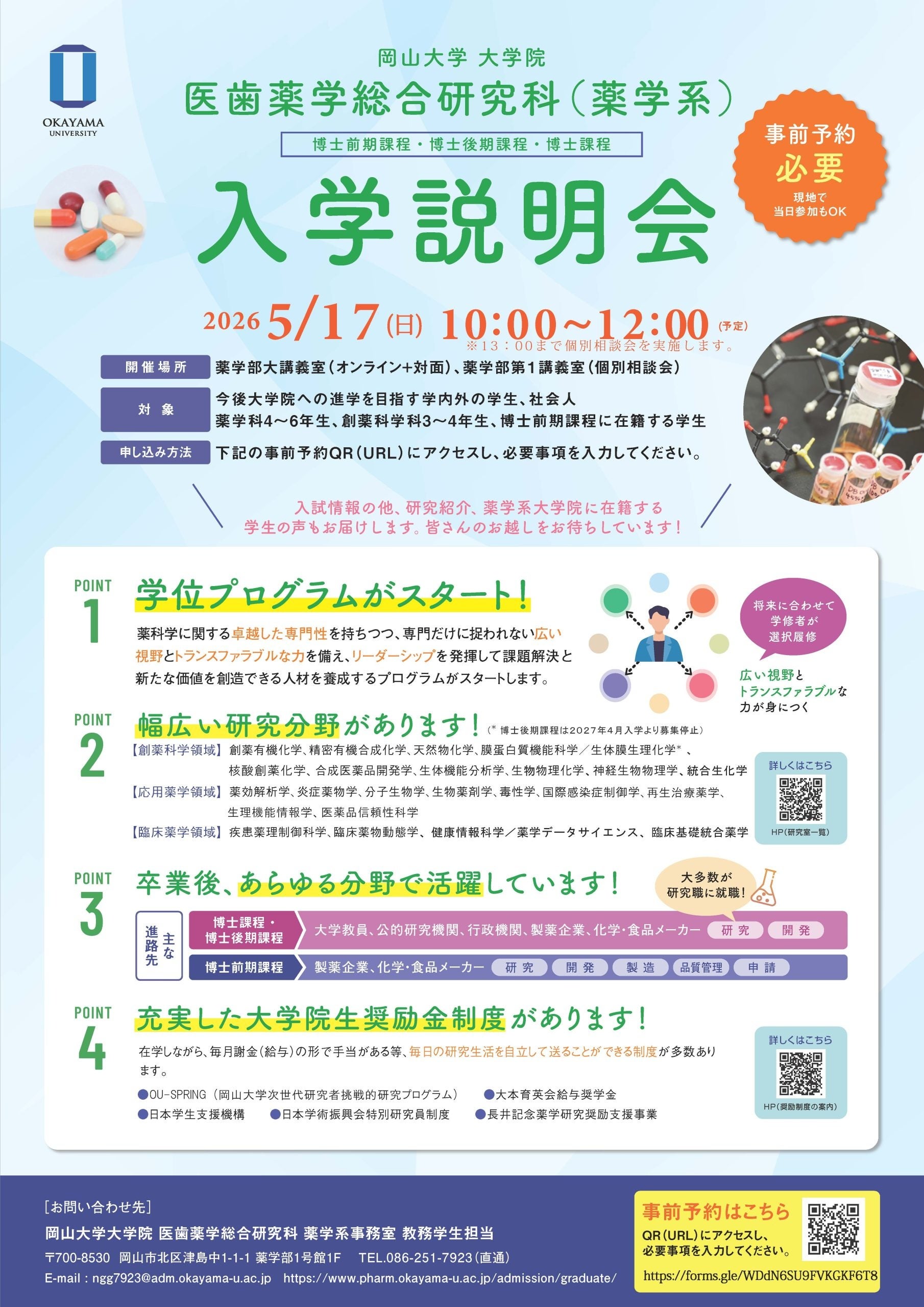 国立大学法人岡山大学(本部:岡山市北区、学長:那須保友)の大学院医歯薬学総合研究科薬学系では、2026年5月17日(日)に大学院入学説明会をハイブリッド形式で実施します。