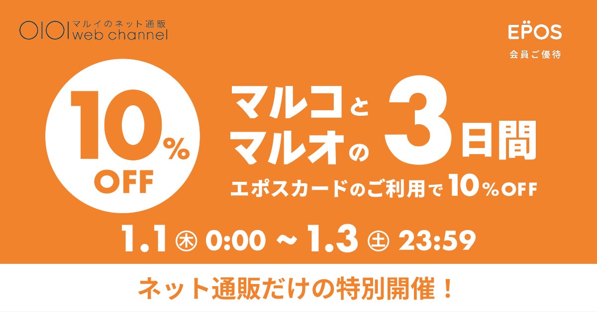 株式会社丸井(東京都中野区、代表取締役社長:青野 真博)は、マルイの公式ネット通販「マルイウェブチャネル」限定で、2026年1月1日(木・祝)~1月3日(土)の期間、エポスカード会員さまご優待キャンペーン『ネット通販限定 マルコとマルオの3日間』を開催いたします。期間中、エポスカードのクレジット払いで10%OFFにてお買物いただけます。