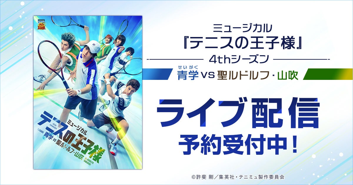 合同会社DMM.com(本社:東京都港区、会長 兼 CEO:亀山敬司 以下「DMM」)はミュージカル『テニスの王子様』4thシーズン 青学(せいがく)vs聖ルドルフ・山吹の2022年7月5日(火)17:30東京公演初日、8月20日(土)12:00/17:30東京凱旋公演、8月27日(土)12:00/17:30東京凱旋公演、8月28日(日)12:00東京凱旋公演大千秋楽のライブ配信・アーカイブ配信いたします。ライブ配信は公演終了後も楽しめるディレイ配信(見逃し配信)付きです。ご自宅や外出先のパソコン、スマートフォン、テレビ画面でお楽しみください。