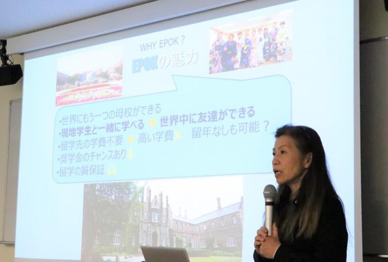 説明会には、各学部から44人の学生が参加。冒頭では、学術研究院共通教育・グローバル領域の大林純子准教授が登壇し、「留学して自分は何を得たいのかを一度英語で書き出してみると、普段とは異なる思考のプロセスを実感できると思います。ぜひ一度書き出してみてください。EPOKでの留学を、これから支援していきたいと思っています」と参加者を鼓舞しながら、EPOK制度の概要等について詳しく説明しました。続いて、国際教育推進課の課員がEPOKに応募するための応募資格や注意点、派遣候補者となった後の流れについて説明を行いました。