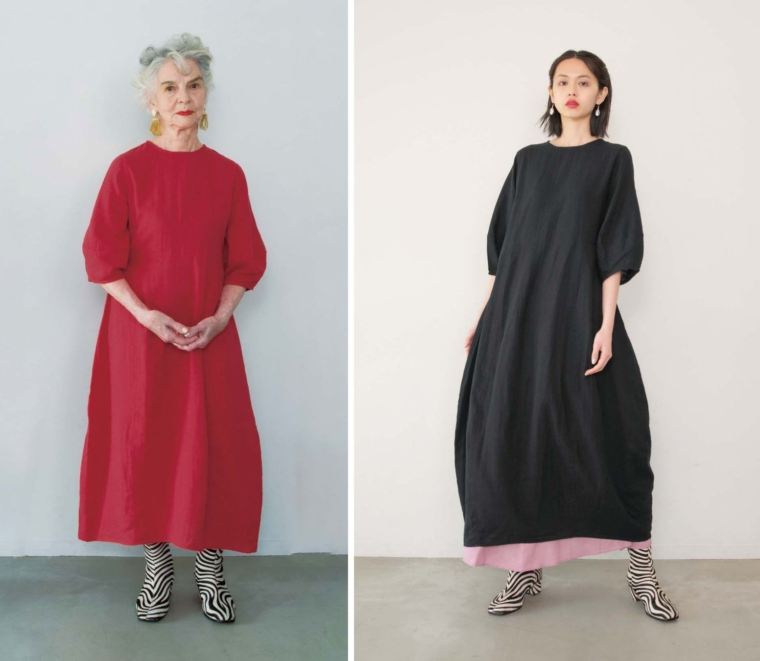 「おしゃれに我慢はいらんやん!」をコンセプトに、“お悩み番長”こと野々村友紀子さんといっしょにつくったワンピース。涼しく過ごしたいけど気になる部分を隠したい……そんなきれいとらくちんを両立する“後ろ姿”の肌見せがポイント。気になる肩と腕はフレンチスリーブでカバーしながらも、程よく肌を見せることですっきりと見せてくれます。一枚でもパンツとのレイヤードでもサマになる、着回し力のある一着です。
