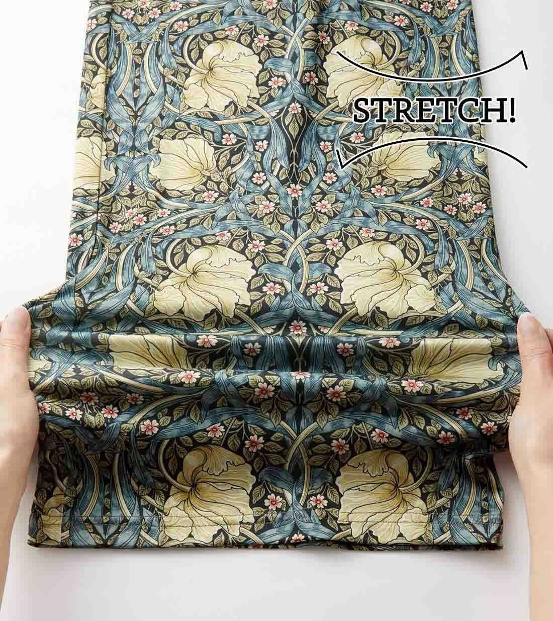 暑い季節、重ね着いらずでパッと華やぐワンピースは頼れる存在。モリスのピンパーネル柄を贅沢に身に纏う、Aラインシルエットで体形を拾わないカットソーワンピースです。ほどよくゆるめのボトルネックが大人っぽく、狭めのアームホールで、下着のチラ見えも心配無用。動くたび揺れるドレープ感とつやめきが〈ピンパーネル〉柄の優雅さをひときわ印象的に引き立てる夏のドレスです。接触冷感&伸びやかな素材でシワにもなりにくく、これからの暑い時期や旅行にも重宝します。