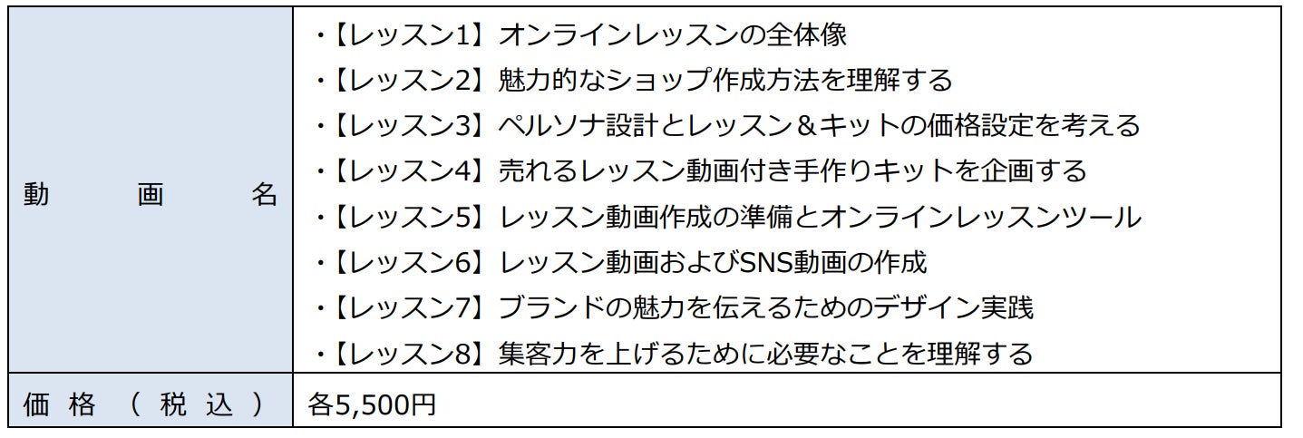 「minne byGMOペパボ」上の『minneカレッジ byGMOペパボ』アカウントより、『オンライン講師コース - レッスン動画』にて使用しているレッスン動画8本をそれぞれ単体で販売します。カリキュラムの作り方から動画制作、販促物に活かせるデザイン制作、Webでの集客方法などオンラインレッスンを開催するための実践的な内容を幅広く学べる内容となっています。動画ごとに学べる内容が異なるため、作家・ブランドは自分のスキルに合わせて、必要な項目のみ習得することができます。