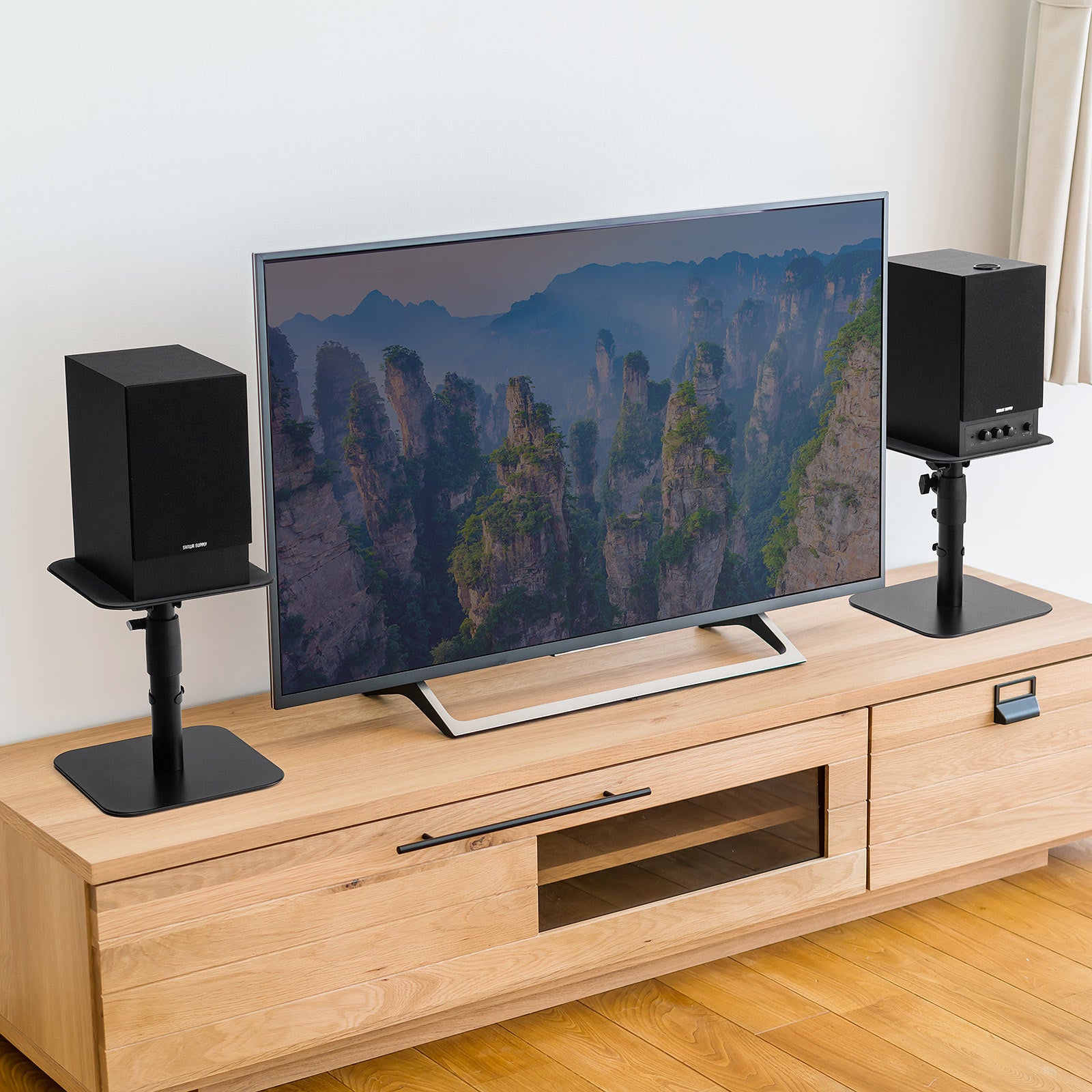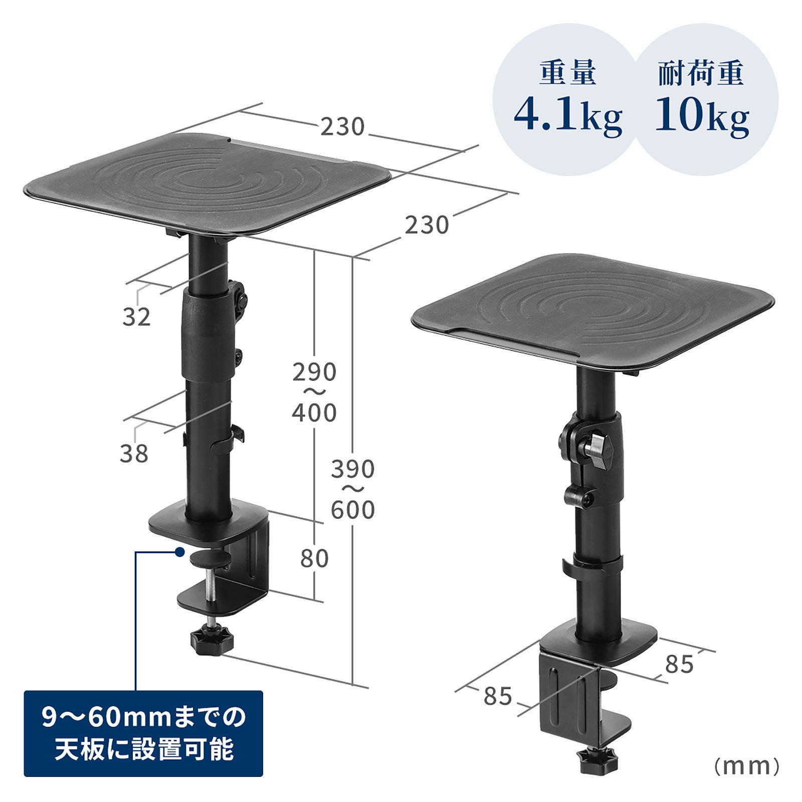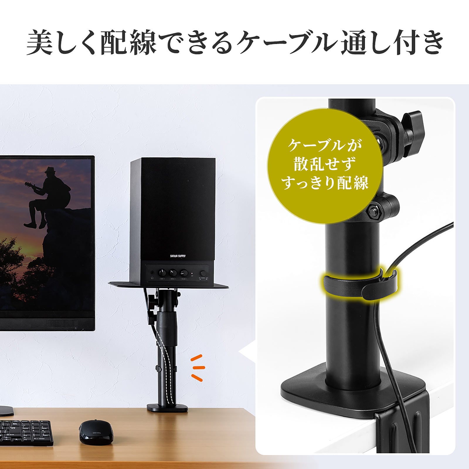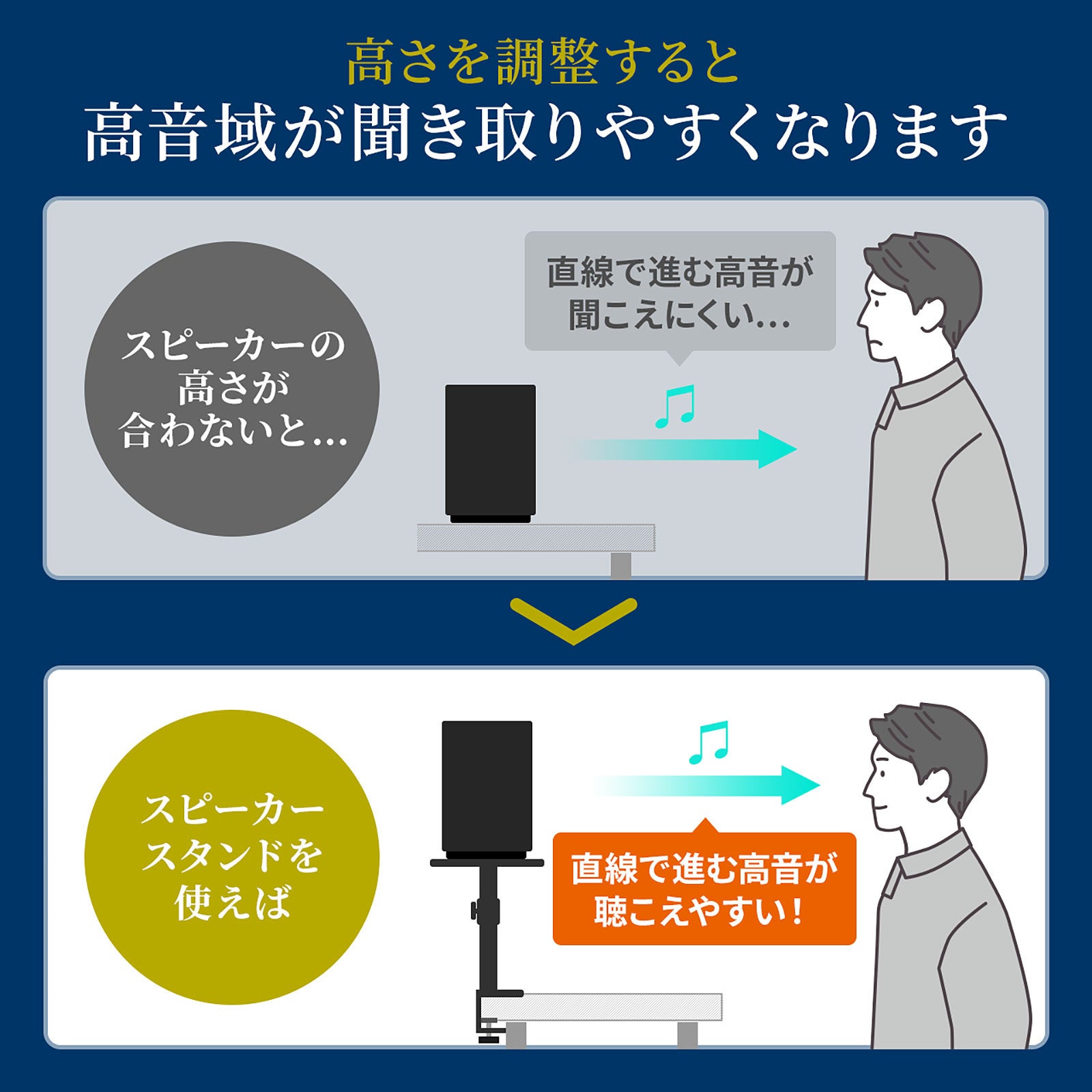 本製品(100-SPSTN01)は、スピーカーの高さと角度を調整できる卓上タイプのスピーカースタンドです。